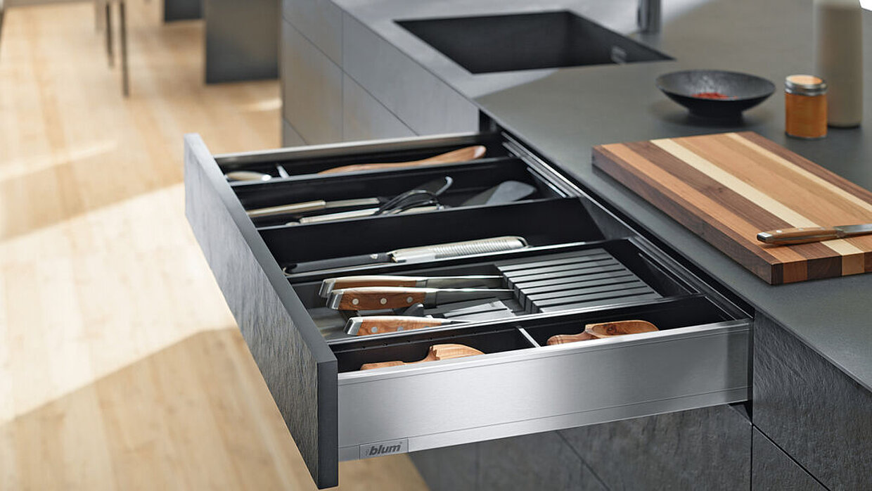 The Ambia-Line inner dividing system was developed for the Legrabox box system and harmoniously matched to it in form, colour and material. The cutlery insert with integrated trays is made of steel and coated with a soft touch material, so that the cutlery can be stowed away quietly. Apart from the steel version, the cutlery insert is also available in a combination of selected wood decors and steel components.