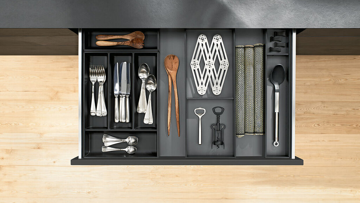 This formally and functionally well-conceived knife holder contributes to improved space organisation in the drawer.