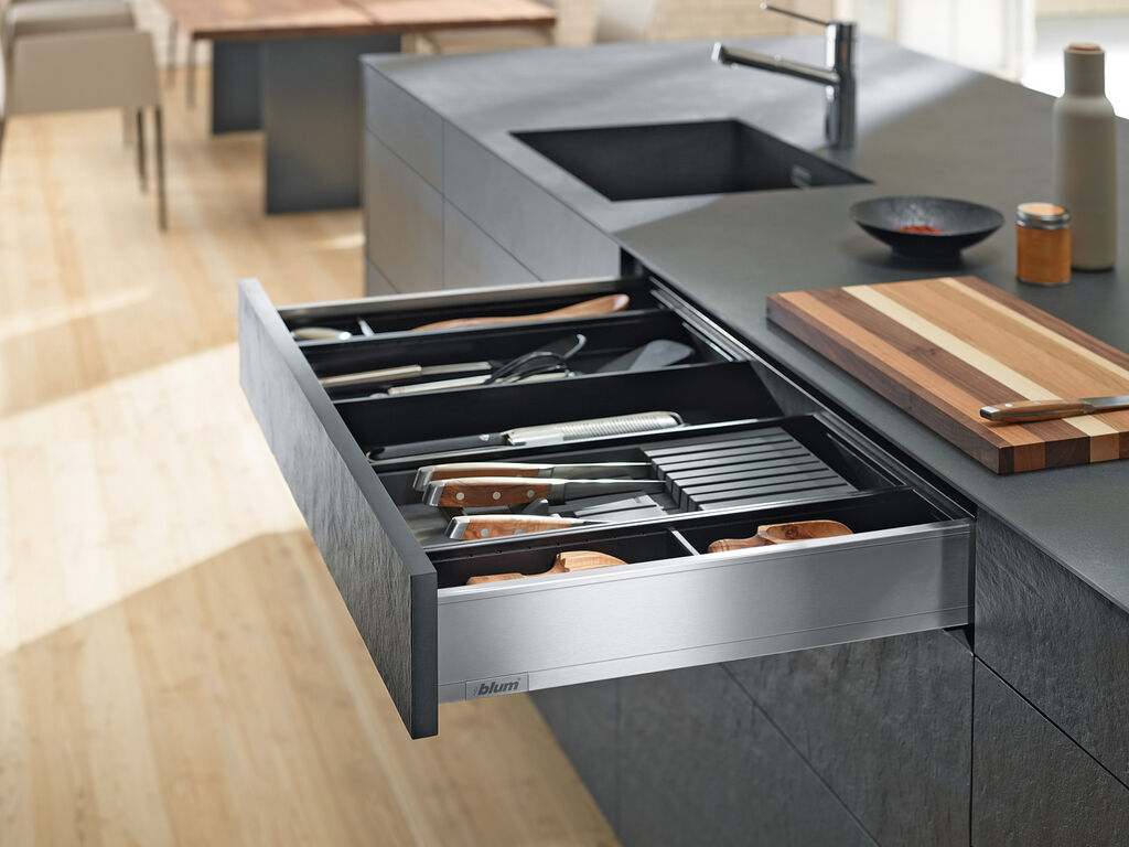 In the Ambia-Line knife holder for theLegrabox drawer system, up to nine knives can be stowed safely, clearly arranged and easily reached. In size and form it matches the high-quality and linear inner dividing system of Ambia-Line and fits perfectly into the framework of the series. The knife holder is made of high-quality plastic with components of stainless steel.