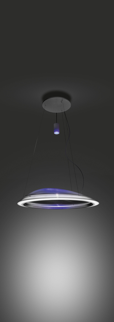 The Ameluna pendant luminaire captivates the viewer with an unusual design comprising a circular shape and an asymmetric volume. Its delicately floating appearance fascinates, with every detail being excellently executed. It embodies a new type of luminaire that also makes a difference through the possibility of interacting with the environment through an app. It seems detached from time and space, conveying a sense of the magical.