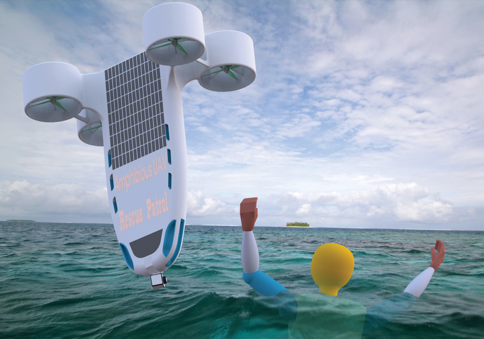 Amphibious Joint-lifeguard UAV is designed to assist beach lifeguards in their task of beach and water surveillance. Positioned on a patrol tower, it stands higher than the beach crowd to get a clear overview of the area. When employed, it flies overhead for ground patrol and serves as co-rescue equipment when swimmers, surfers, and other water sports participants are in danger. This charging patrol tower can also be installed on the back of the lifeguard’s pick-up truck.