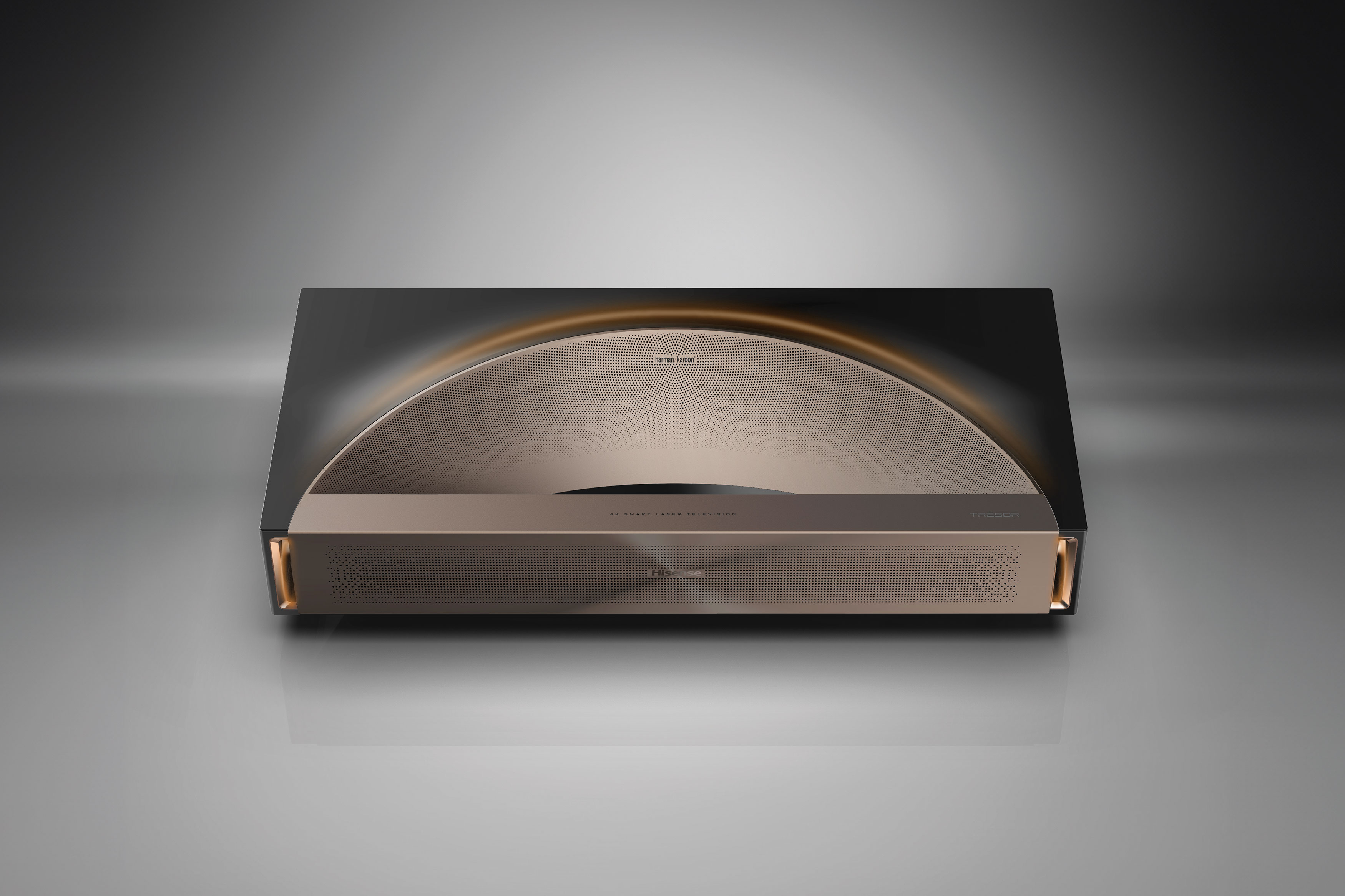 This laser TV features a theatre-style top sound chamber design, creating a three-dimensional sound space atop the main unit to enhance audio quality. Sound mesh holes on the curved surface integrate with the semi-curved light emission area, creating a harmonising circular opera house effect. The top black semi-transparent glass emits a crescent-shaped dynamic light, evoking the image of a rising moon.
