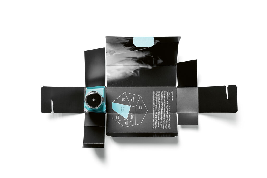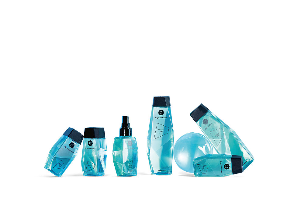 The ANAS Crystalcare cosmetics line incorporates a piece of real Quartz Crystal inside each product, a fact that is reflected by the packing design. Each product name has been placed inside a crystal shape. When united, all of these crystal shapes create the heptagonal form of the company logo. The bottles have also been contoured to reflect this crystal concept, while the design of the boxes follows the idea of gradually unfolding and revealing information about the product. The principle of unfolding culminates in the revelation of the product and the optical heptagonal mechanism.