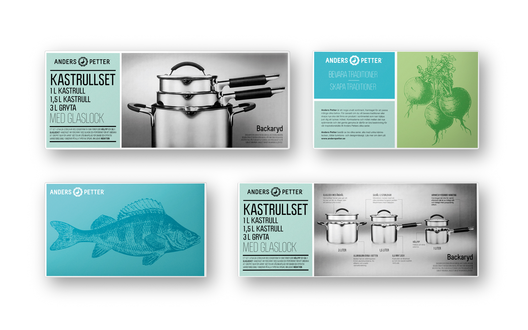 This packaging concept was developed for Anders Petter’s series of high-quality kitchen products, ranging from cookery to dining items. Based on marketing goals, the design focuses on both preserving and fostering tradition. The contrast between product innovation and the 30-year-old Swedish heritage of this cookery brand is emphasised by the multi-functionality of the product range. The illustrative imagery is reminiscent of classic Swedish kitchens, while the logotype reflects the pride and joy of a food heritage originating from the country’s landscape.