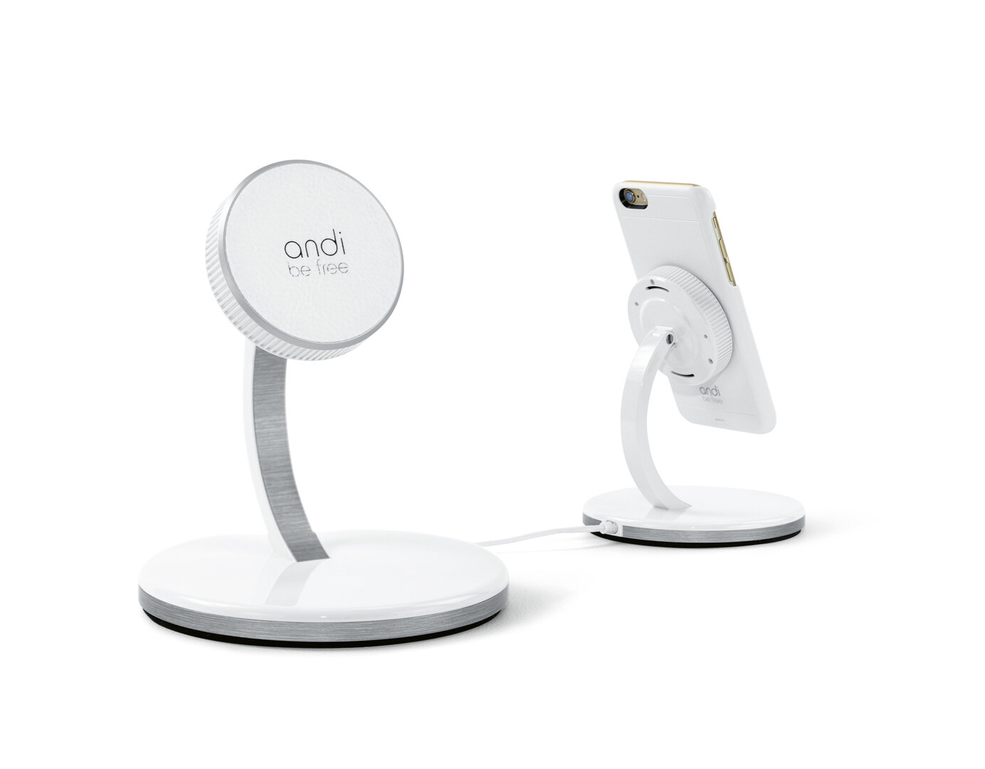 The elegant andi be free is manufactured from high-quality materials and is wirelessly charged in combination with magnetic mounting technology. The smartphone is thus held wirelessly by the charging station. It can be used at a vertical viewing angle, while it is quickly supplied with new energy. The phone can be fitted to the charging station with one hand and can be turned between portrait and landscape view. A special anti-slip feature assures a secure hold.
