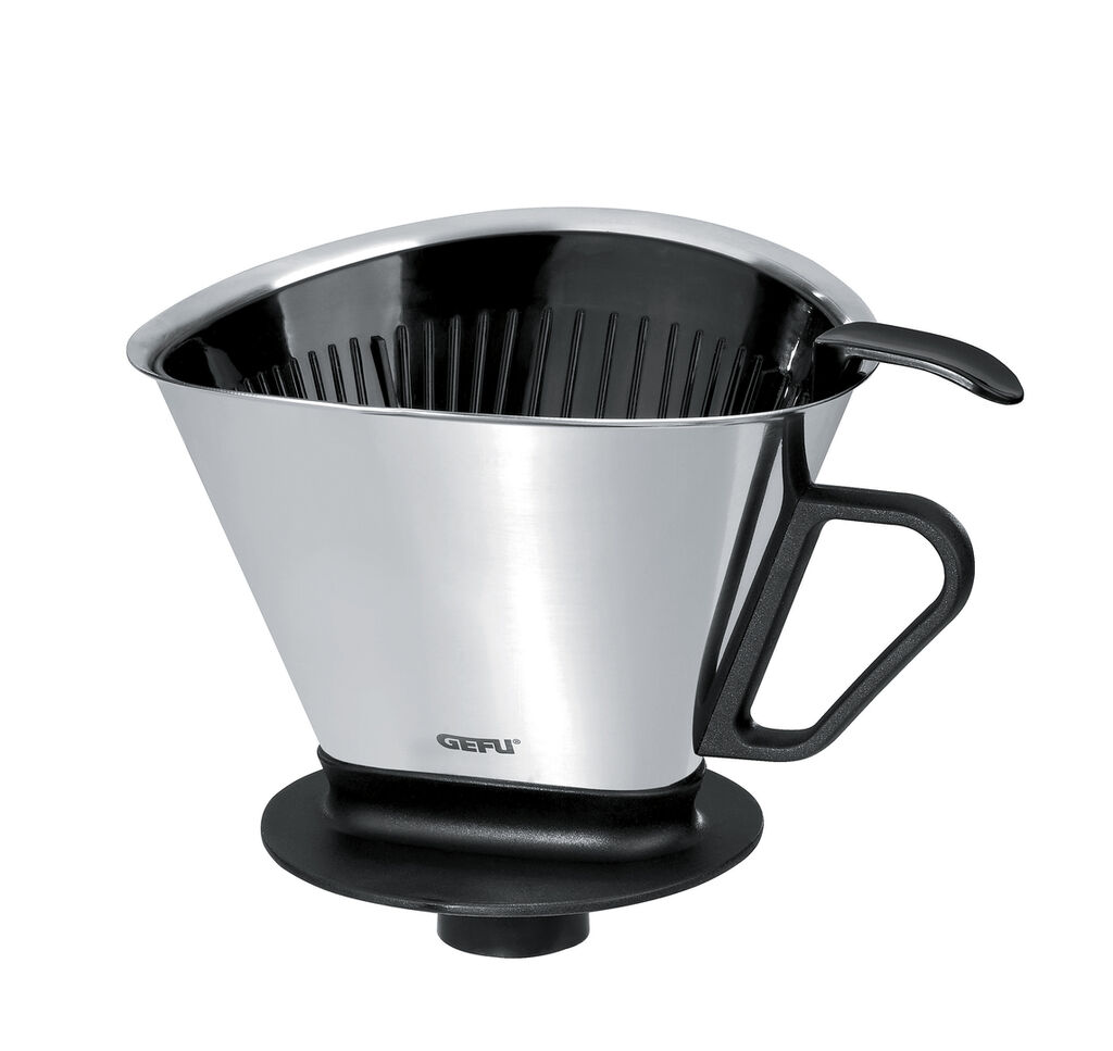 The coffee filter Angelo is functionally well thought out. Developed for the preparation of freshly brewed coffee, it has a dishwasher-safe stainless steel filter for paper filters of size four and smaller. It features an additional polypropylene insert to keep water temperature at a constant level. The adapter of the handy product solution has been designed to fit easily on various types of coffee pots.