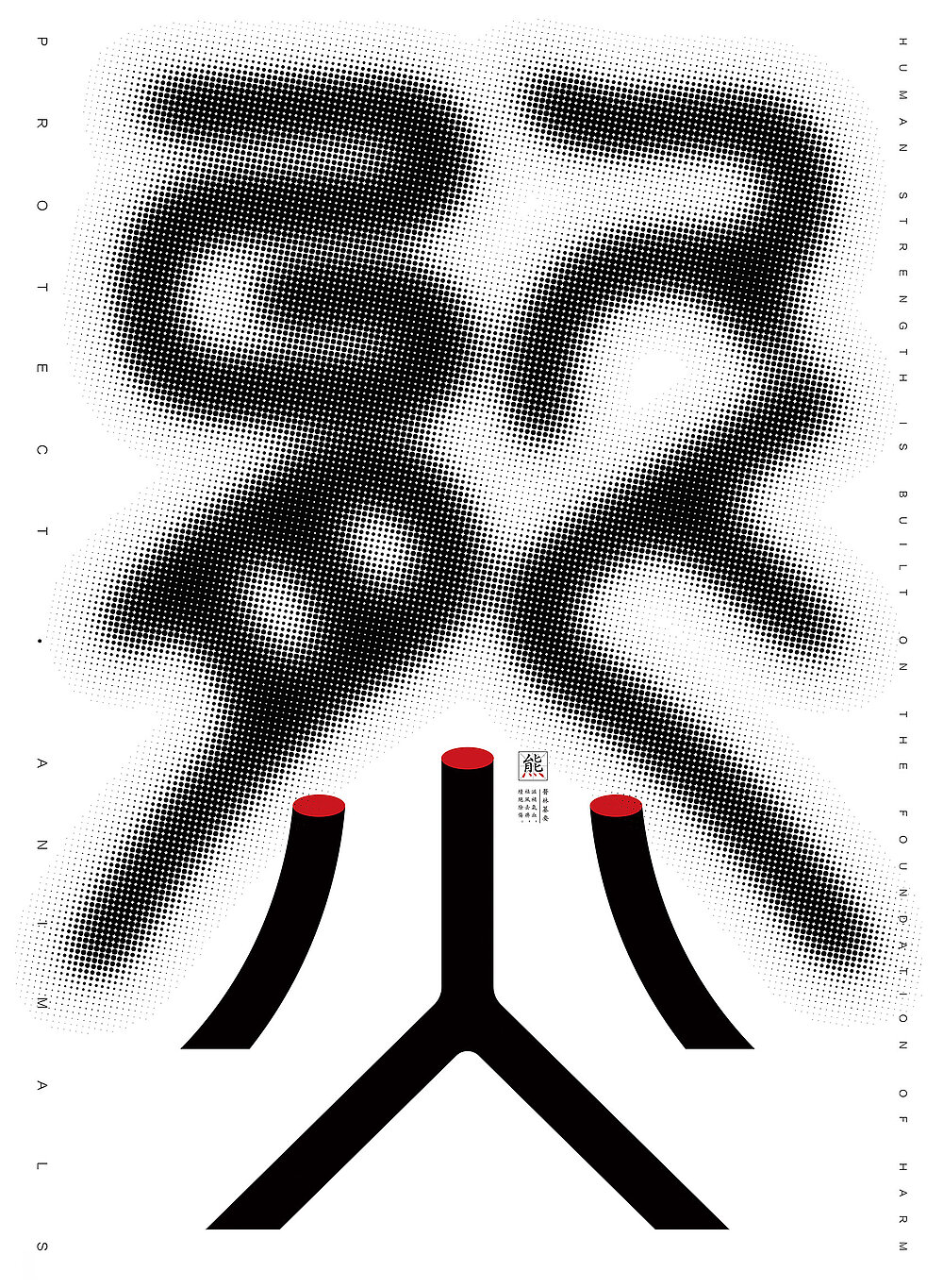 This series of posters uses Chinese seal script’s pictographic nature to address animal welfare issues. Associating script strokes with “fish fins”, “bear paws”, and “deer antlers”, the posters highlight the harm caused to animals for human health benefits and advocate against excessive exploitation. The work asks people to consider both the global ecology and the long-term development of human civilization.