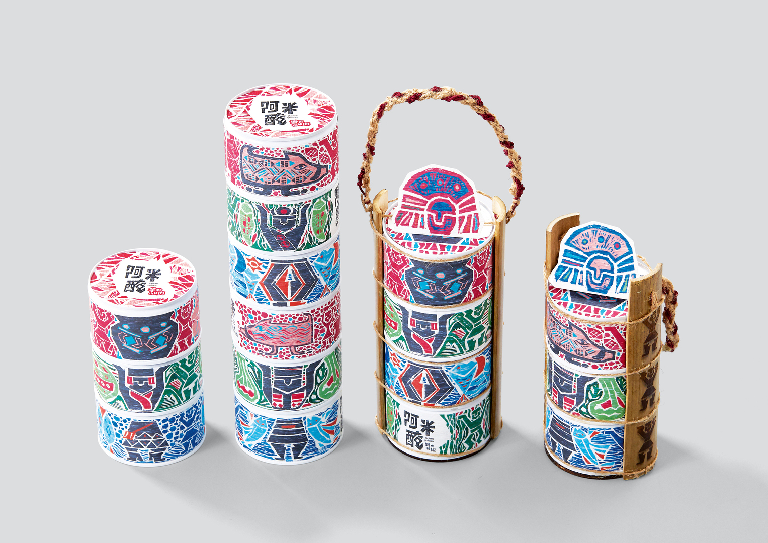 The totem pole plays an important role among the indigenous people of Taiwan as it documents tribal histories. Recipes for marinated food are also passed on from generation to generation. This packaging design picks up on the idea of collected memories by stacking pop cans with marinated food on top of each other. The cans are designed with ethnic patterns in harmonious colours. The outer packaging, made of bamboo and hemp, is reminiscent of aboriginal design styles and environmentally friendly. The boat-shaped gift box holds three glasses and uses paper to imitate the texture of betel leaves.