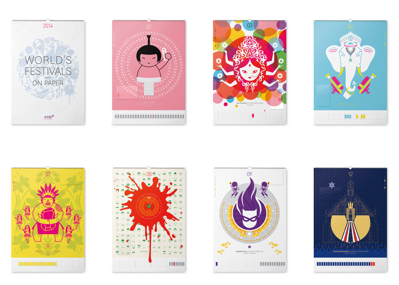The Antalis Wall Calendar 2014 was designed under the motto “The World’s Festivals – on paper”. It presents selected festivals from around the world on premium paper with multi-faceted finishes. From the Día de los Muertos in Mexico to the Holi Festival in India – every one of the twelve calendar sheets speaks its own visual language reflecting the colours and signs of the respective festival. Additionally, the calendar includes a small brochure for each month and festival as well as a smartly illustrated legend with small pictograms.