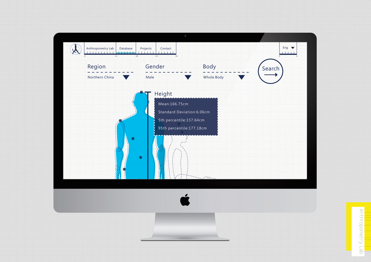 The website Anthropometry Lab by Foxconn Information Ergonomics Center in Taipei includes a database of human measurements as well as research projects about how to use the data for industrial design optimisation. Instead of displaying the database via table and text – like other conventional anthropometry platforms – a search interface with images and lines was developed in order to interact with the user in a different way. The most important information is conveyed along with sketched illustrations, keeping the website plain and simple.