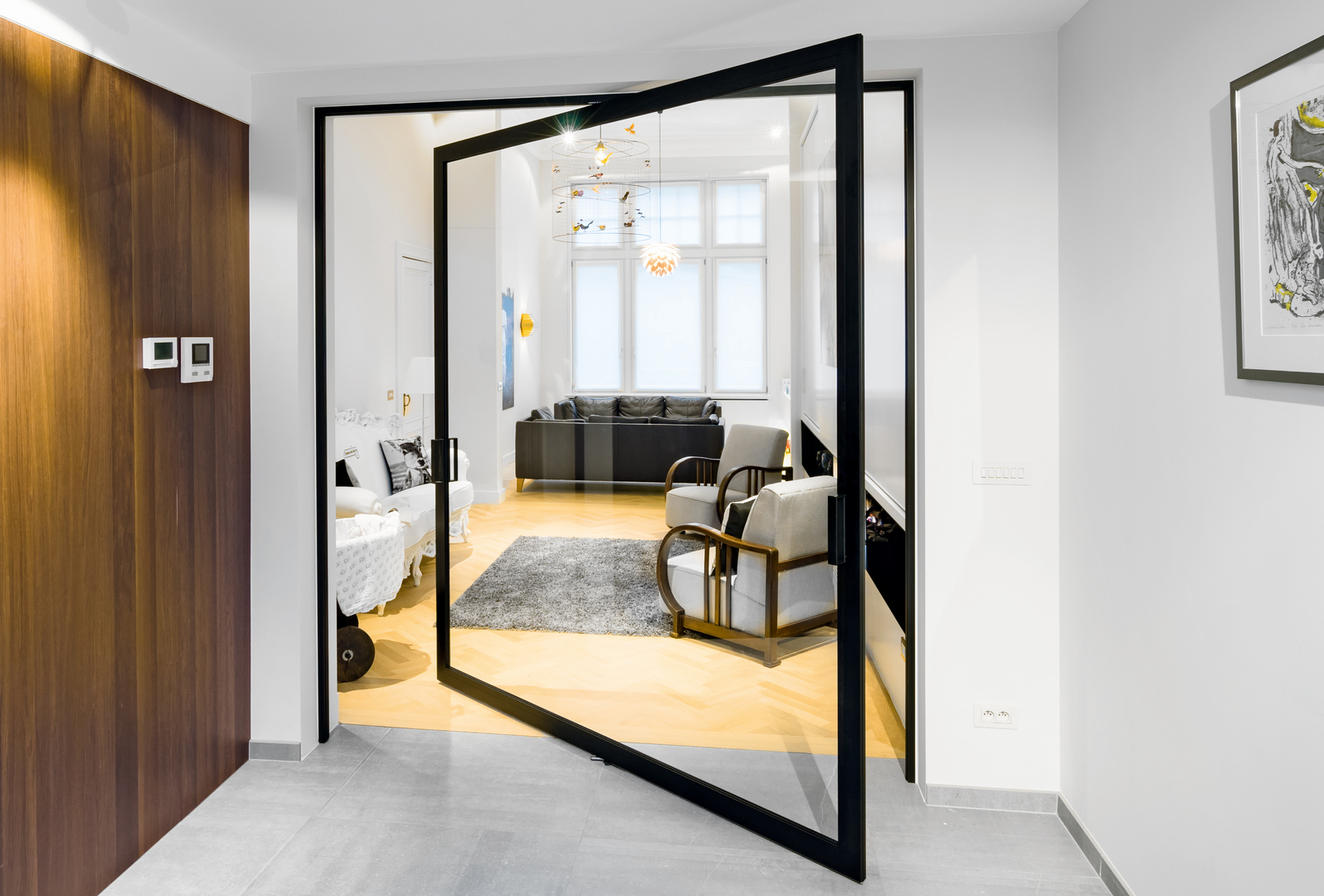 These elegant room dividers have hinges integrated into the door frames that allow them to open through 360 degrees. A mechanical, self-closing pivot system with 90-degree positioning makes opening in both directions easy, despite a weight of 150 kg. As the bolts and plugs only require holes to a depth of 35 mm, the dividers may be used with any type of floor structure, even if it contains underfloor heating.