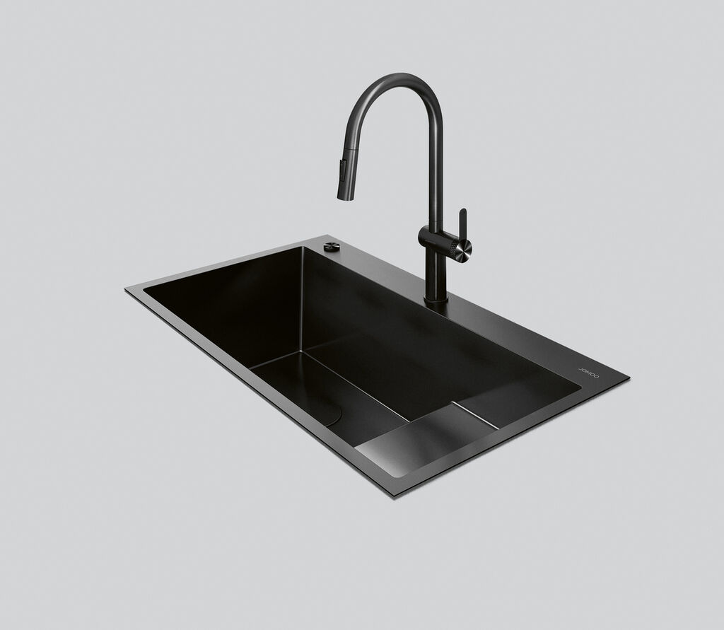 The clearly designed kitchen set from the Apex series is characterised by an oil- and scratch-resistant surface, which is the result of a complex manufacturing process and the use of nanotechnology. The large sink and the tap in combination with the round push-button create an elegant ensemble of geometric elements. The matt black colouring as well as the non-slip structure of the tap handle underline a modern effect.