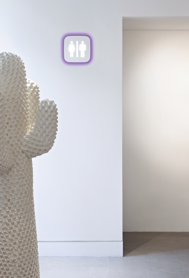 The design of the APPS wall-mounted luminaire is based on the concept of “flying signs”. With only a single LED, two different types of lighting are achieved: the illumination of the sign itself and an additional soft perimetric light, which can be set to different colours. This creates a sign that appears to be floating in front of the wall and which discreetly integrates into the respective surroundings. As rooms and facilities are not permanently used for the same purpose, it is highly advantageous that the signs can be exchanged easily, without having to remove the installation frame from the wall.