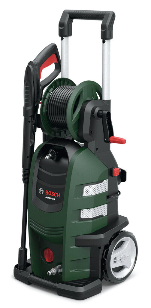 The AQT 60-16 high pressure washer features storage space for all accessories, including a gun and three lances, a choice of nozzles, a cleaning agent container, a cable and a hose. The handle can be extended to a height of 980 mm or retracted completely into the body for transport. The large footprint and the additional footplate provide stability and safety. The large wheels have been designed especially for uneven paths and stairs and feature a self-cleaning tread design.