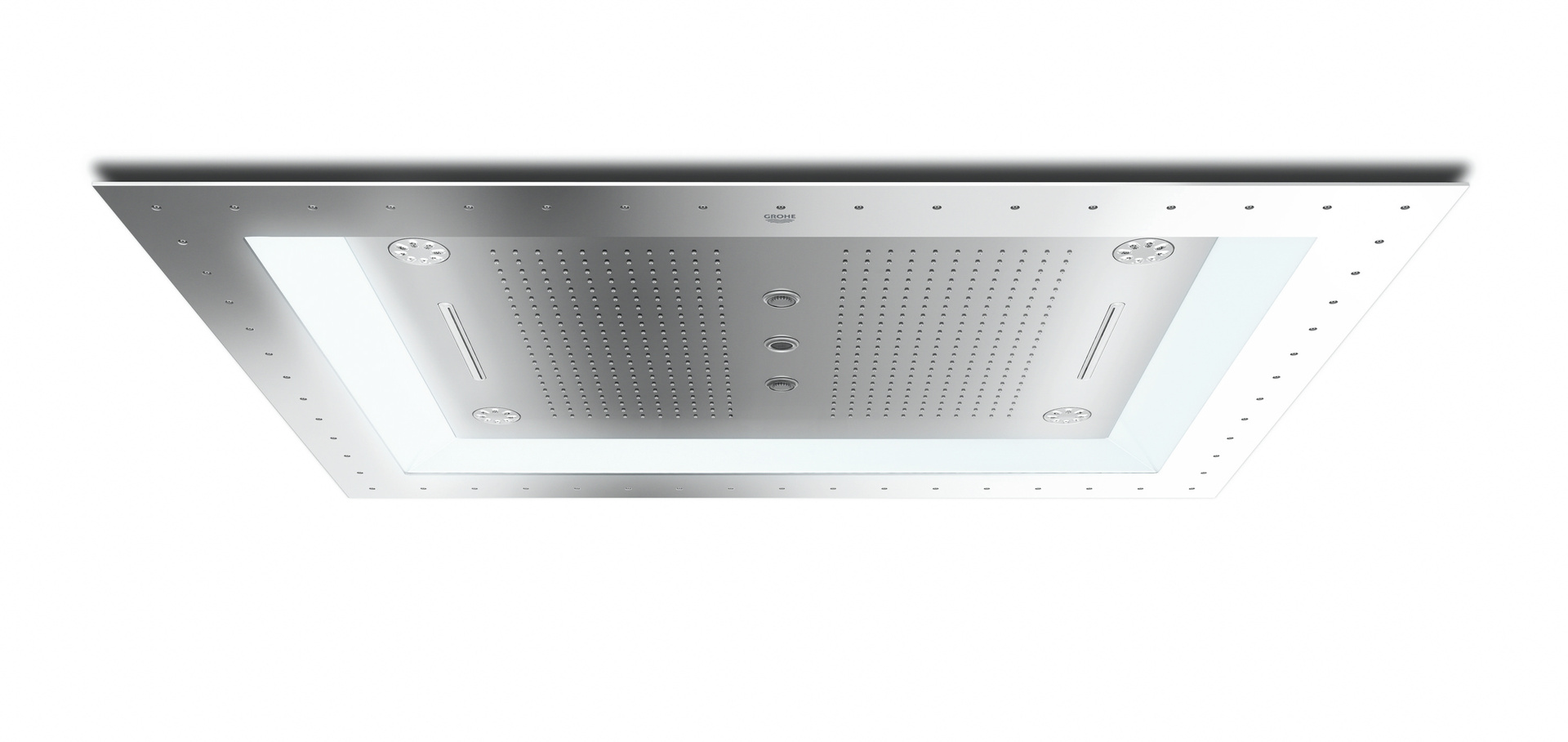 AquaSymphony is part of the modular Rainshower F-Series 40". The spacious element is mounted to the ceiling; it measures more than one metre at its widest point. Various spray patterns from a rain curtain and cold water mist nozzles to the massaging Bokoma jet meet the users’ individual needs. In addition, innovative water, light and music effects can be selected. The amount of water is evenly distributed to all active nozzles. A chrome finish ensures the longevity of the product as well as easy cleaning.