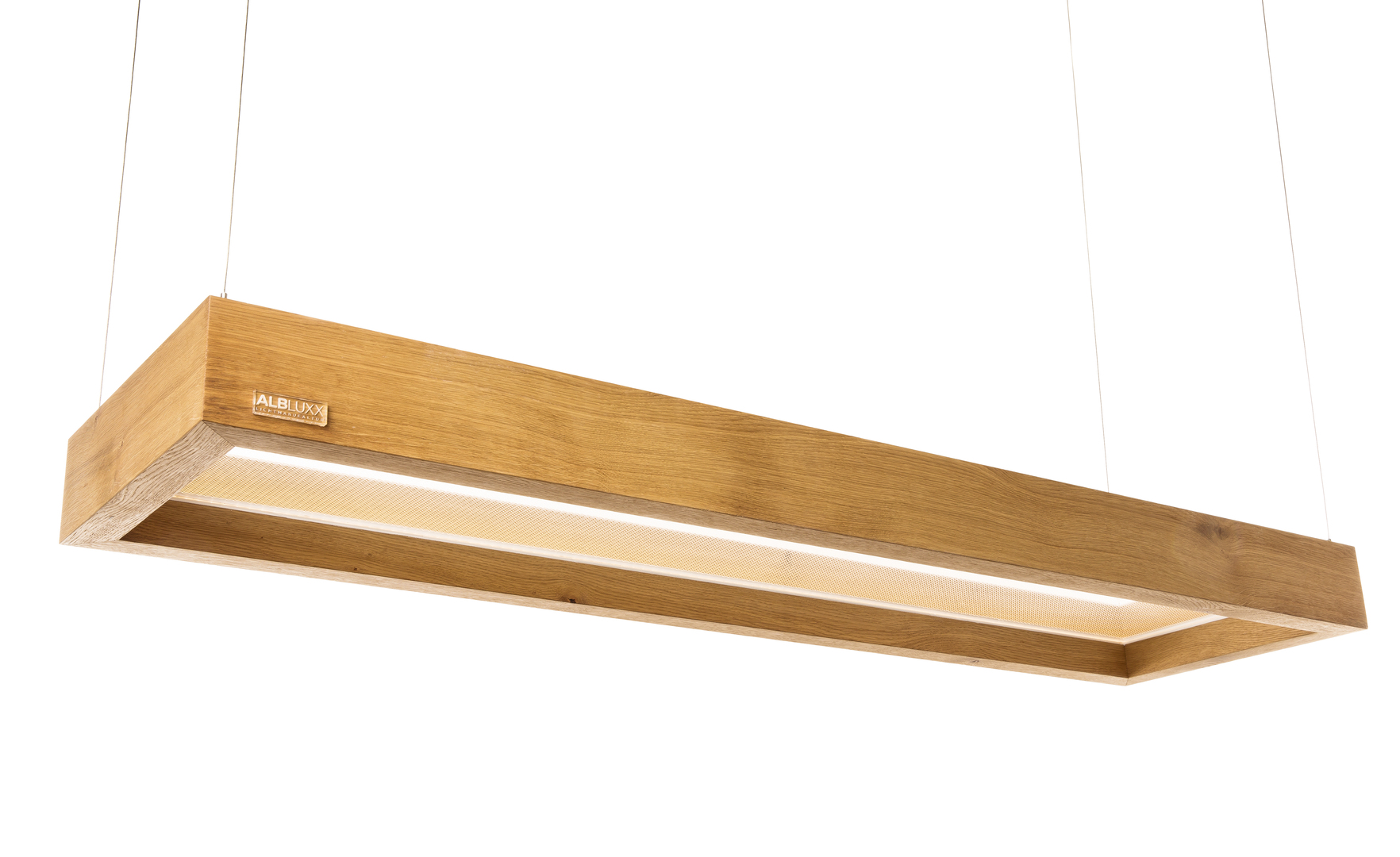 The Arboreus pendant luminaire follows a minimalist design concept. The rectangular wood frame houses a hidden light source that only becomes visible in the form of an illuminated panel when the luminaire is switched on. The light distribution of 50 per cent direct and 50 per cent indirect light creates a pleasant ambience. Arboreus uses low-voltage technology in incorporation with a suspension system. Made of German Oak, the pendant luminaire combines high-grade materials with cutting edge LED technology. When the high-performance luminaire is switched off, it looks like a frame floating in the air.