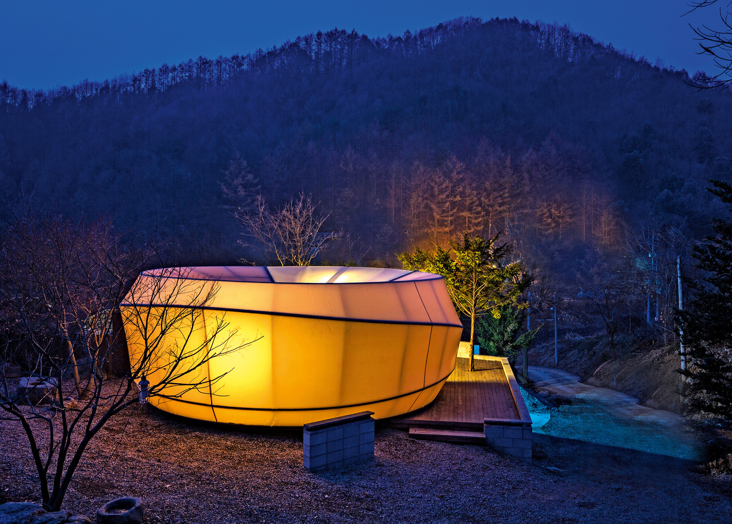 The design of the project “Glamping in Korea” by ArchiWorkshop / SpaceTong was inspired by models from nature. The tent-like pavilion merges the poetic shape and appearance of a pebble stone with the advantage of an individually adjustable structural flooring system based on the juxtaposition of modular floors. The resulting tent structures allow for versatile arrangements in terms of functionality and aesthetic appeal. They can transform into an attractive exhibition hall just as easily as a trade-fair pavilion. An art wall painted by young Korean artists is featured on the wall inside.