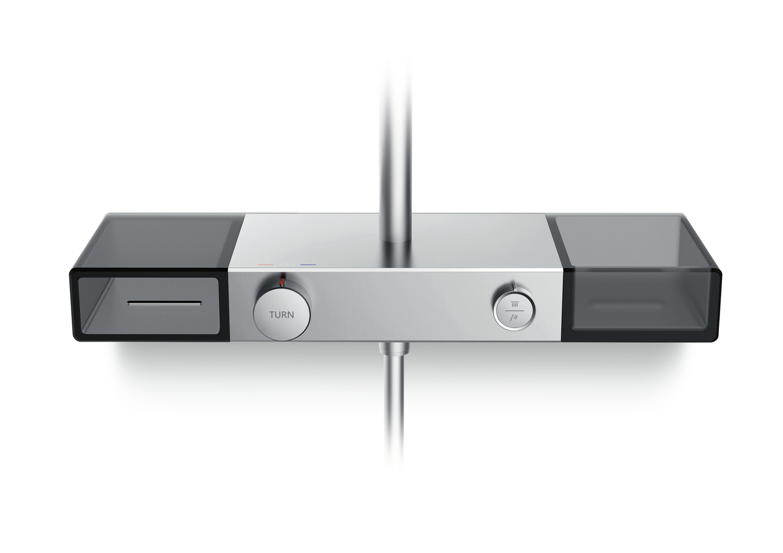The design objective of this shower system was to achieve a clear, uncluttered appearance that catches the eye with its material combination of metal and biodegradable plastic. The clearly structured division of control element and storage area lends Area a purist look and makes the operation and setting of the water temperature and spray types easy to understand at a glance. Intuitive symbols and a simple lettering on the controls communicate the correct operation.