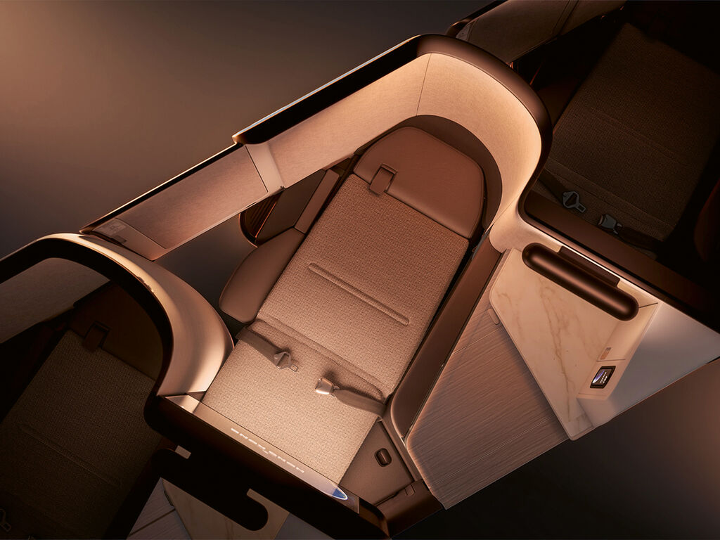 Aria Suite interprets business class as an individual retreat, with an emphatically calm design. A surrounding 3D shell shields the view of the aisle and promotes a feeling of privacy. Flexible storage solutions and a sliding console support modern usage scenarios. Materials such as leather, wool and textured surfaces reflect the demand for tactile quality and durability. Activity modes, ceramic frame elements and barrier-free functions round off the concept.