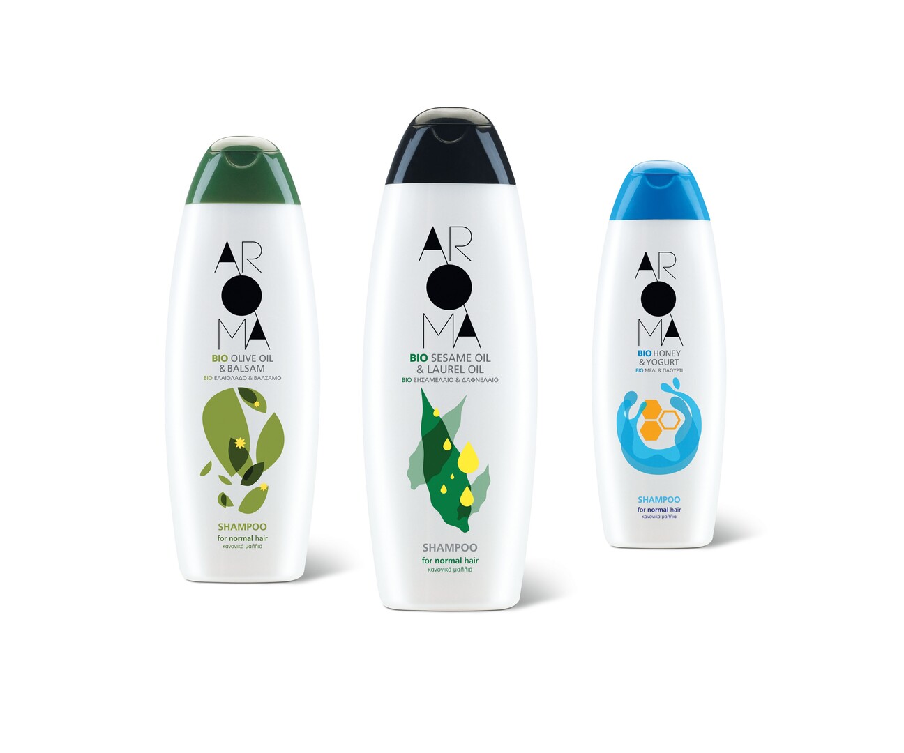 The packaging design for the Greek brand “Aroma” (the Greek word for fragrance) comprises a comprehensive product range of organic hair care products available in supermarkets. The objective was to develop a distinctive product appearance that clearly stands out among numerous competitors. Stylised depictions of the two main ingredients were designed for each of the three “Aroma” lines: olive leaves and balsam flowers, bay leaves and golden sesame, oil, milk and honey. The typography is sharp and black, setting an interesting counterpoint to the bright colour palette of the graphics.