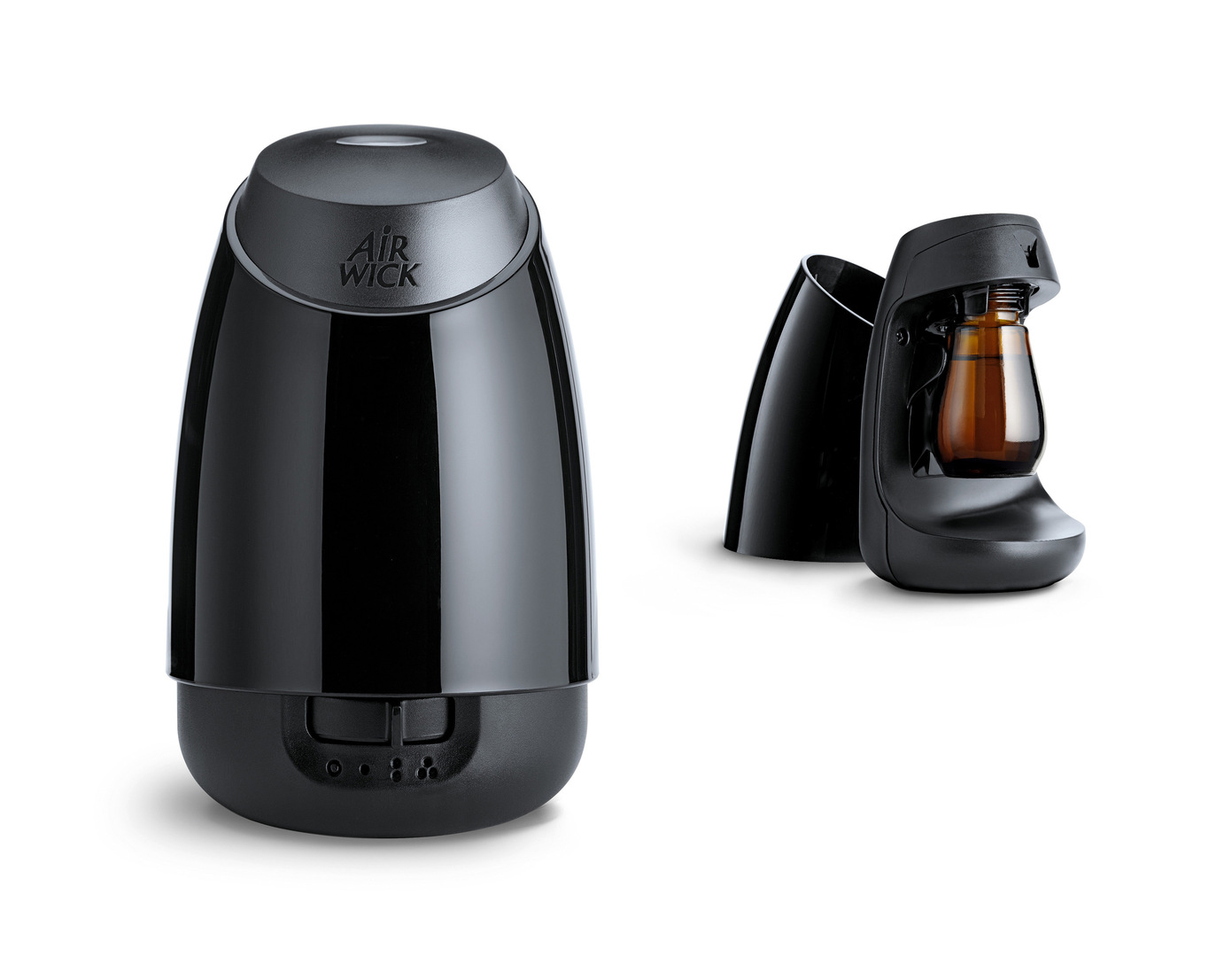 The Aroma-Oil Diffuser provides a natural and consistent fragrant experience by transforming essential oils into a fine mist. The device is battery powered, refillable and operates completely silently. Its compact size allows discreet placement anywhere in the home while its automatic 8-hour-cycle ensures that fragrance is released only when needed. The device has been developed with future flexibility in mind, allowing new designs to be launched reflecting changing trends, regional tastes or even allowing consumers to customise their own device.