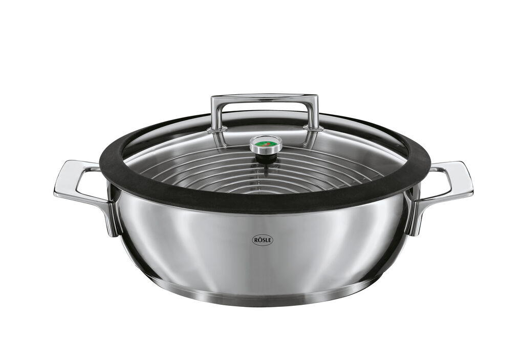 In the aroma steamer, vegetables, fish and other food keep their natural taste, vitamins and minerals. The stainless steel pot features an encapsulated sandwich bottom and a 5 mm thick aluminium core. The lid, made of shatterproof glass, has a silicone lip seal thus ensuring optimum circulation of the water vapour. The cooking process can be checked with a thermometer integrated in the lid.