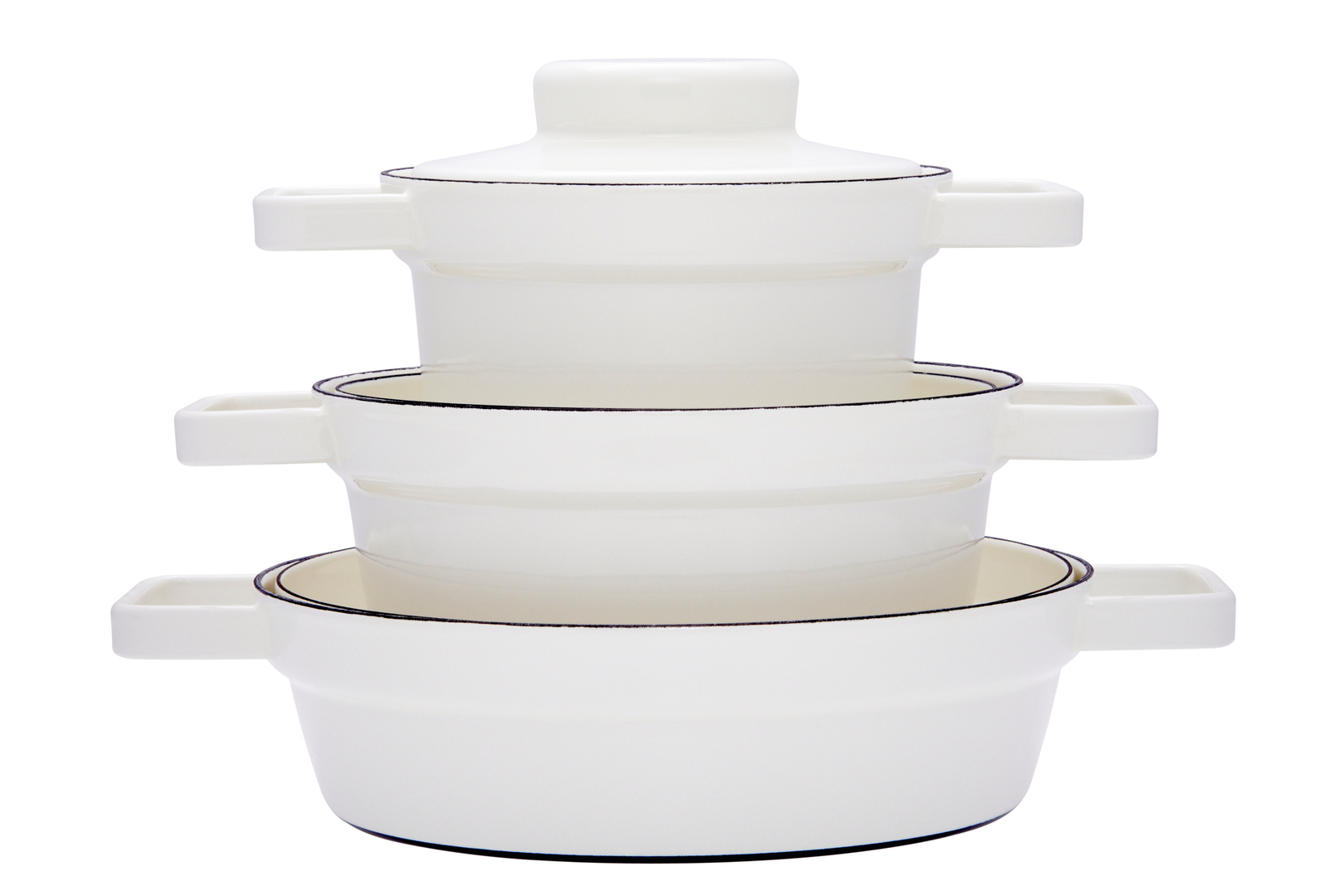 This stackable enamel pot series is suitable for induction cookers and allows energy saving cooking. Restrained and plain integrated handles and a black lip give the enamel set an innovative look. It comes in many colours.