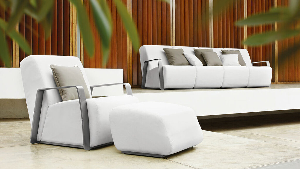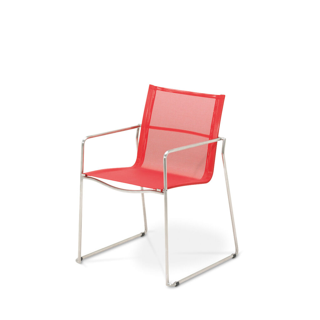 The Asta outdoor dining chair features coloured sling-panels that can easily be exchanged to express any mood with a different hue. It comes in a mix of patterns, from powerfully vibrant to elegantly muted colours. The sling panels, which can be easily slipped onto the frames of the dining chairs, the matching lounge chairs, and the stools, stand out due to the seamless transition between seat and backrest.