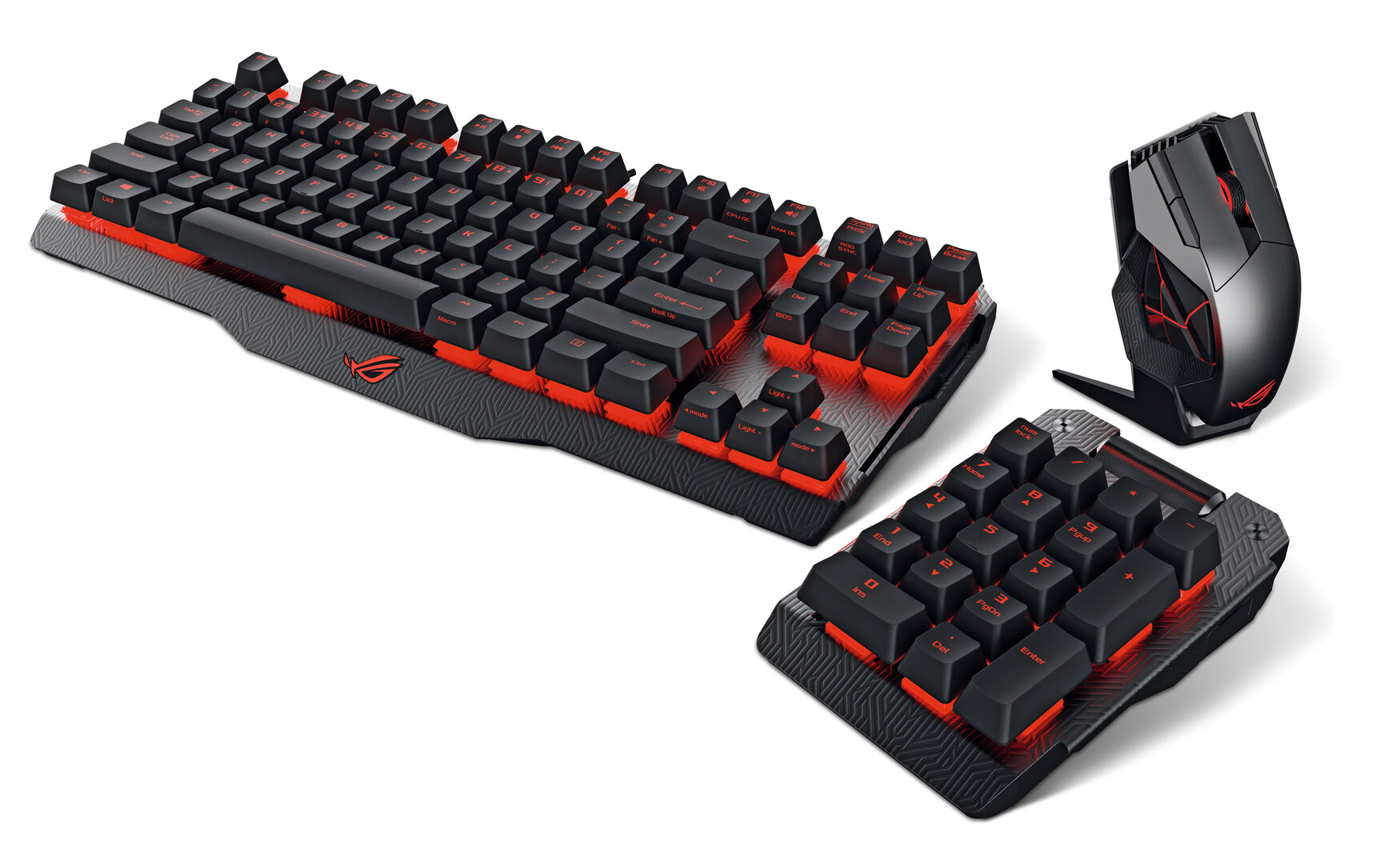 The ROG Claymore keyboard and ROG Spatha mouse consist primarily of metal, rendering them especially robust and durable. Both devices offer options for individual adjustment: the numeric keypad may be separated from the keyboard, and the mouse can be used with or without a cable. Moreover, the mouse includes 12 function keys that can be programmed using macros, as well as six thumb keys for shortcuts.