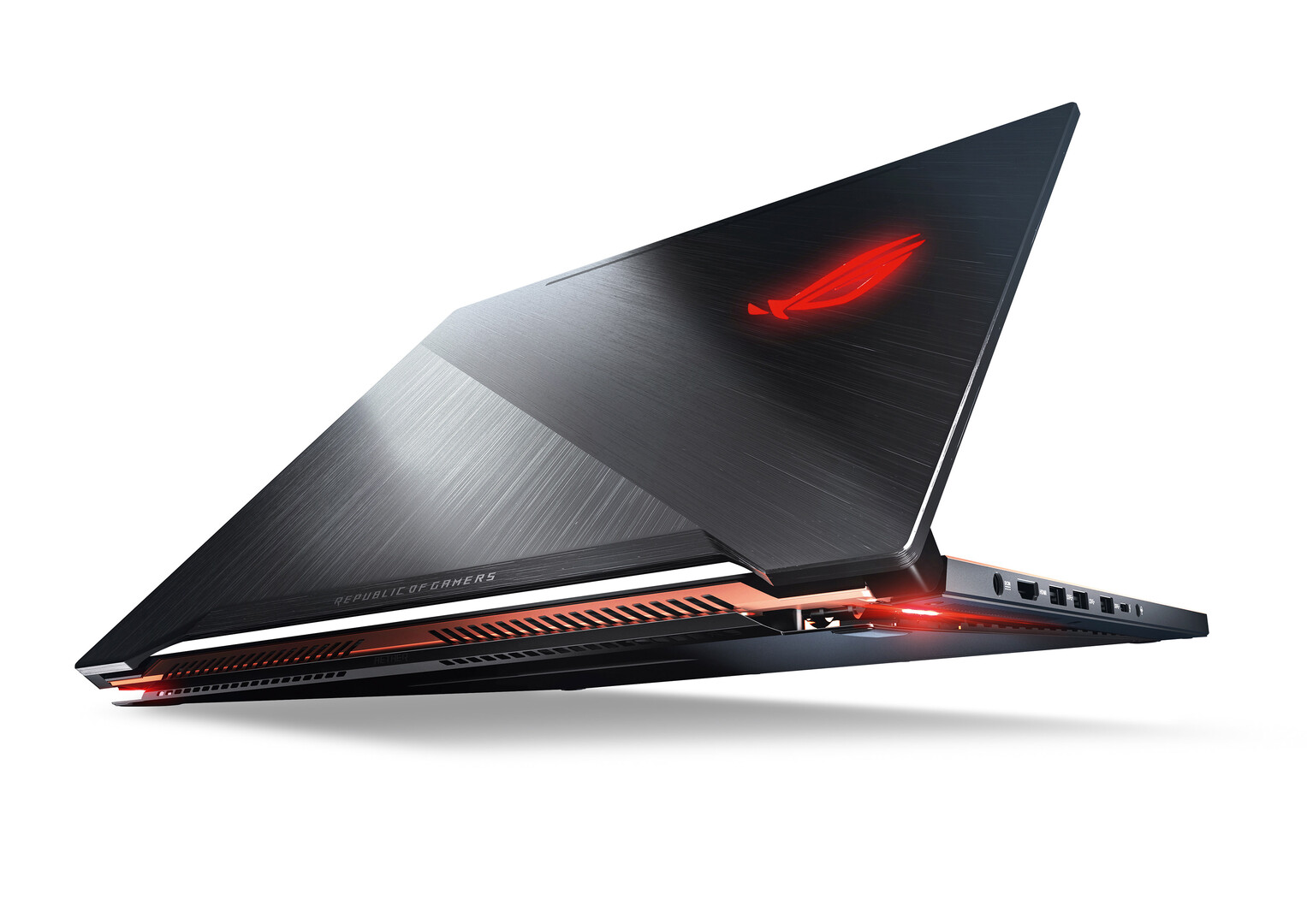 With its minimised thickness of 16.5 mm and reduced weight, the Asus ROG GX501 can be easily taken anywhere. When opened, a hinge system enlarges the special cooling module. The device has a solid metal chassis with a composition including magnalium to enhance both its appearance and functionality. The surface with the variously running hairline pattern is clearly split by a transverse line. The copper-coloured edges are applied to the aerolite-hued surface in a two-phase anodising process.