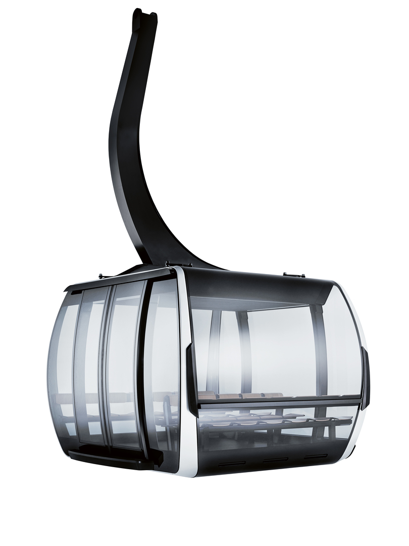 The new ATRIA gondola, with its clear, harmonious lines and rounded shape, conveys a tidy and elegant overall appearance. The underside of the cabin is cleanly sealed, and the hanger is integrated into the roof. The large-area panoramic glazing and the slenderly dimensioned fittings create transparency and provide a view of the surroundings. The interior appears spacious and airy, with ergonomic details and the use of wood and textiles, as well as pleasant acoustics and lighting, increasing passenger comfort.