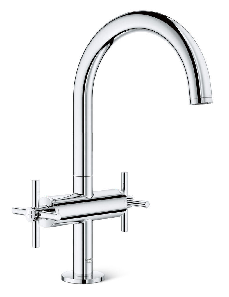 Atrio combines a classic, timeless design with a geometric language of form. The rosettes, handles and body are marked by round elements. The sleek silhouette of the tap collection is reduced to the essential. The slender body is based on a circle and merges into an arch-shaped spout, creating an appealing contrast to the distinctive cross handles for regulating the water flow and temperature. The taps are available in SuperSteel, chrome and brushed graphite finishes.
