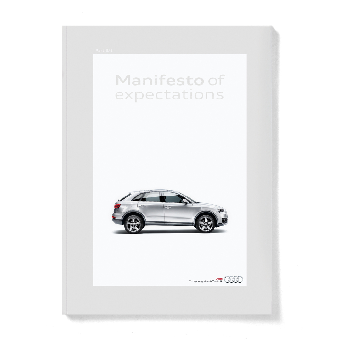 The three-part “Manifesto of Expectations” for the launch of the Audi Q3 compact SUV is printed on unassuming grey newspaper, which again is under-printed with an opaque white background to offset the red and black colour palette and the grey areas. The content is also understatedly journalistic in style: designers, architects and artists outline their anticipations for the future. The Audi designers and engineers do the same – in an informative manner, without resorting to buzzword-like truncations and always relating to the product claim “Built from new expectations”.