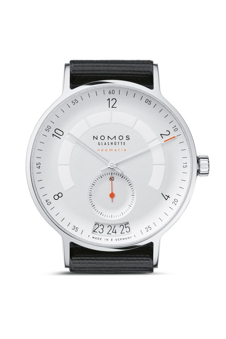 The sporty automatic wristwatch has a progressive design which shows a certain irony. The curves of the white silver-plated dial are reminiscent of a racetrack, while the elongated date window presents yesterday, today and tomorrow all at once. Wide fields of superluminova flank the hour numerals and make the watch legible at night as well. At the heart of this 41 mm diameter timepiece is the innovative DUW 6101 movement.