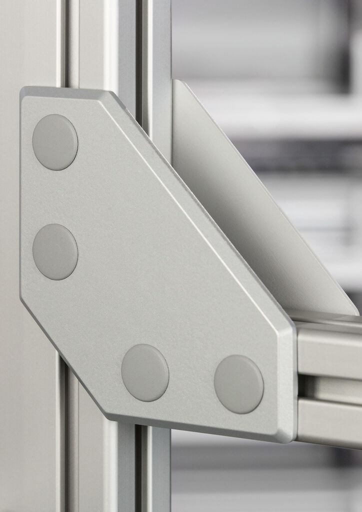 Thanks to patent-pending functional geometry, these preassembled sets of automatic flat and angle brackets are easy to fit into any necessary place using just one hand. High-strength industrial construction can therefore be erected and disassembled in a particularly fast way. During installation the screws fit into place automatically; when tightened they form a strong connection between the aluminium profiles.