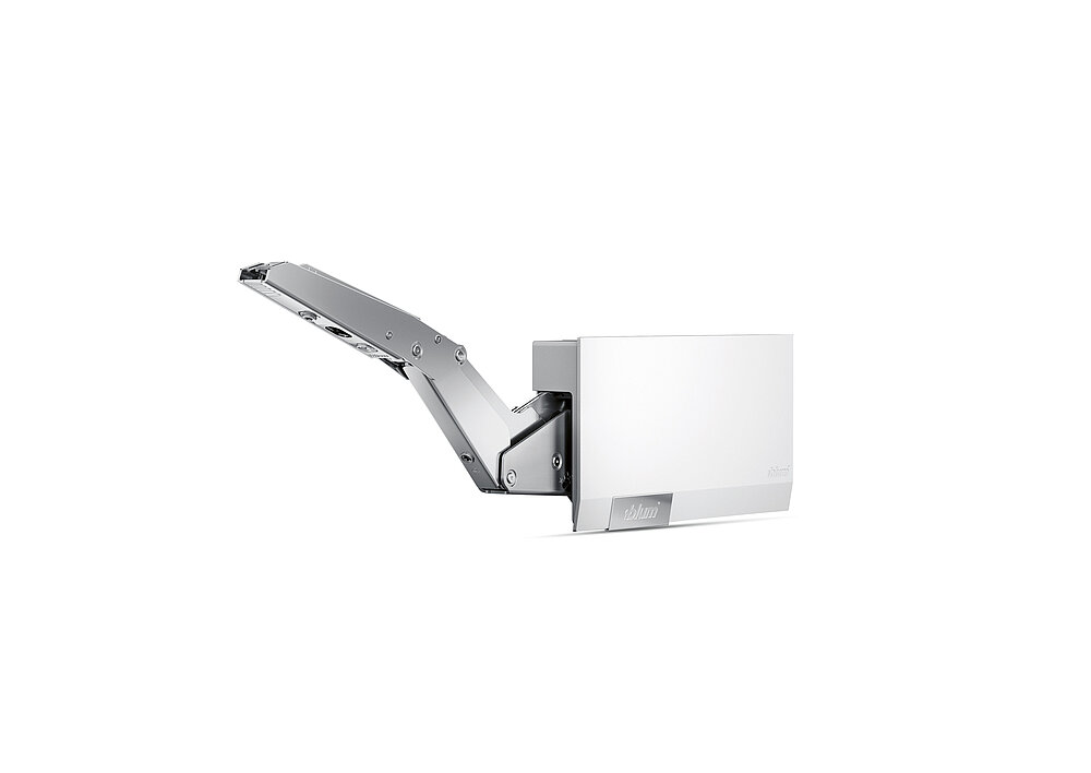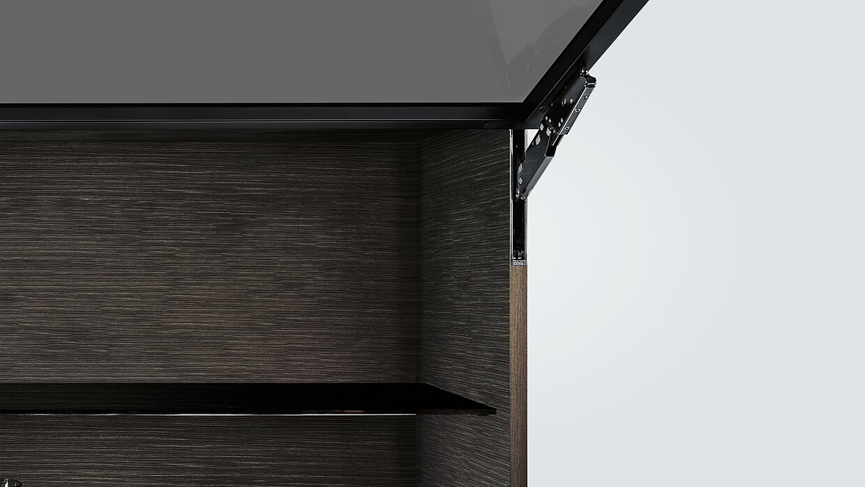 With its unusually small dimensions, this fitting for use on doors of tall and wall cabinets harmonises elegantly with any body. Aventos HK top also eases fitting in industrial furniture manufacture with premounted system screws and for handmade units due to an integrated assembly jig. The fitting can always be mounted symmetrically on the left or the right side. The stay lift system offers three optional motion technologies: “Servo-Drive”, “Tip-On” and “Blumotion”.