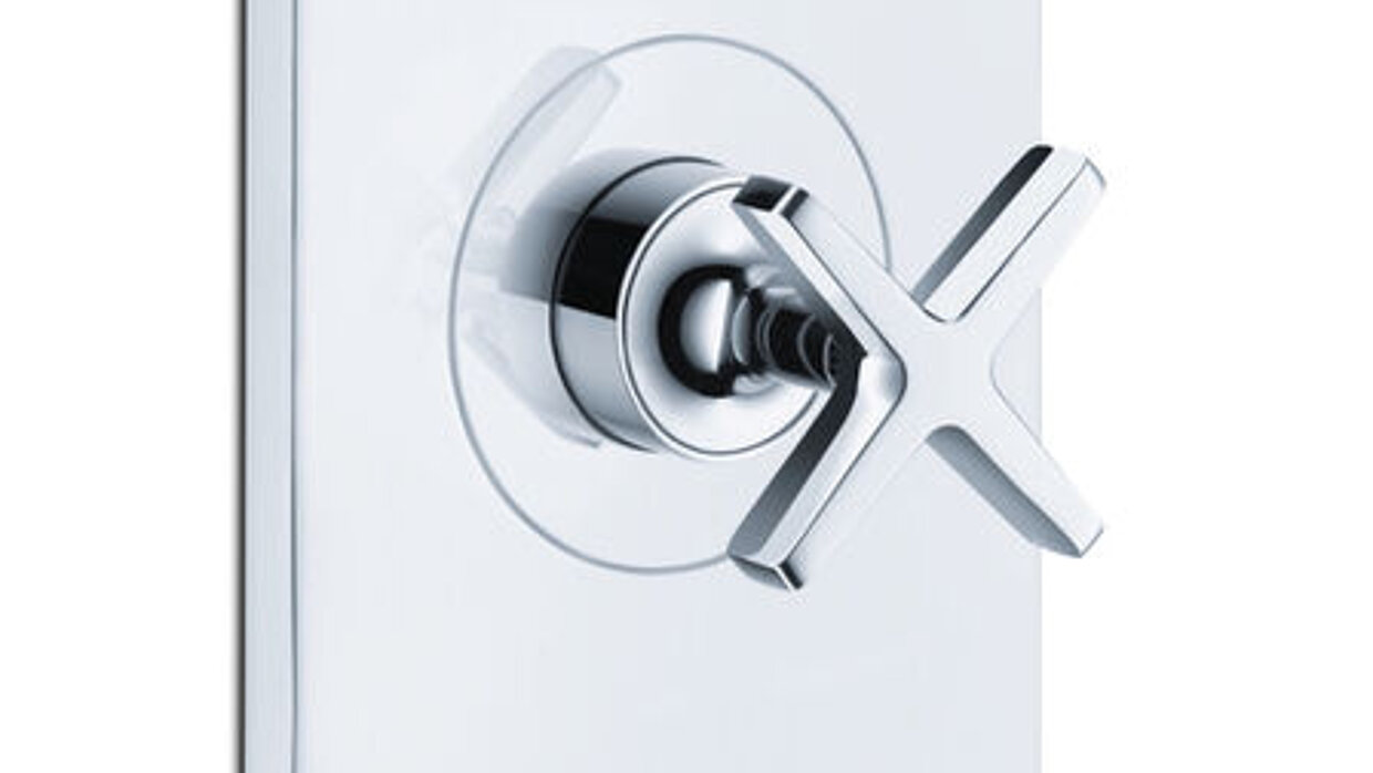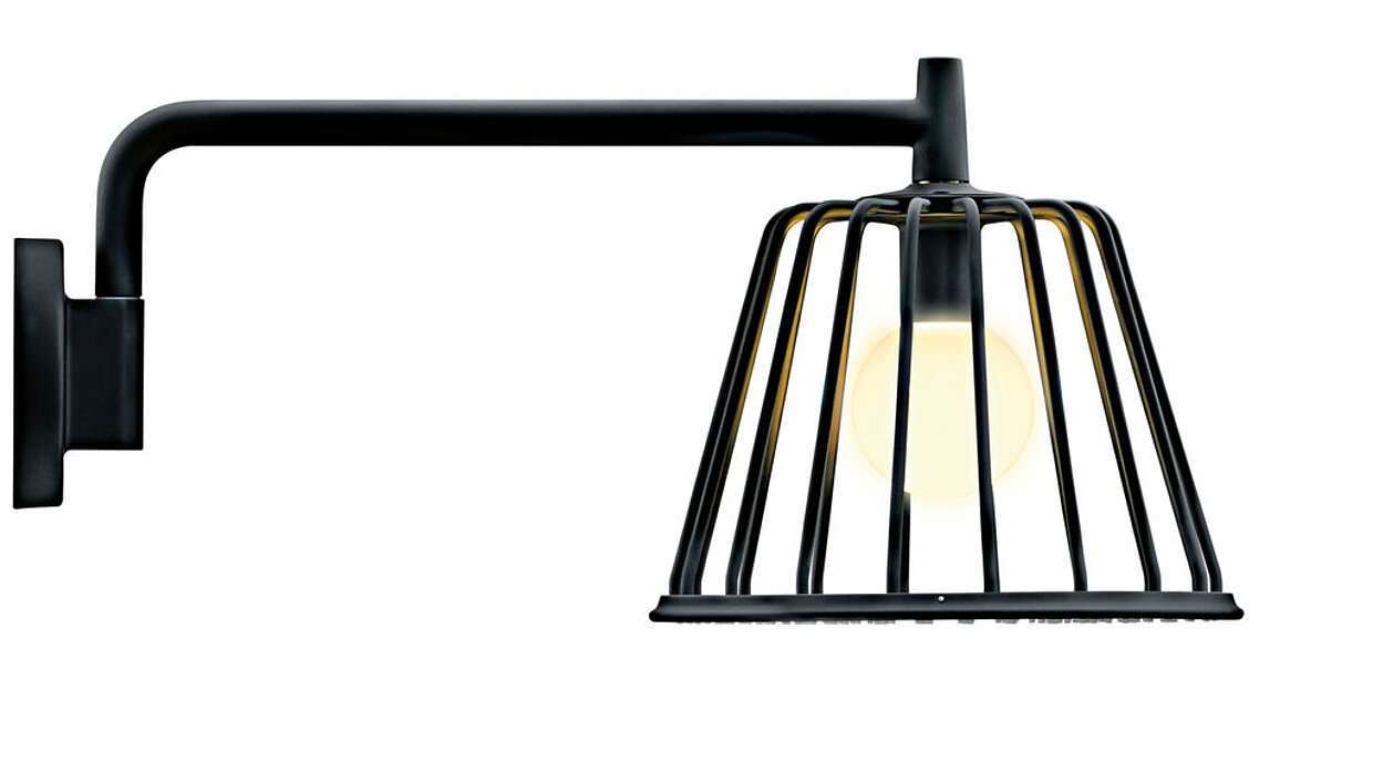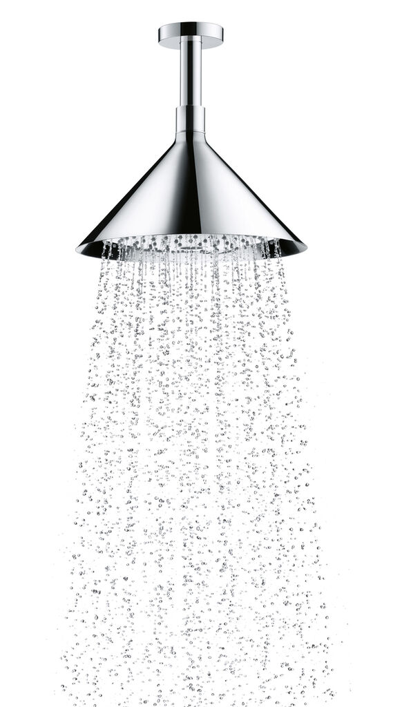 Its funnel-shaped design makes the Axor overhead shower an eye-catcher. With a 240 mm diameter, it is well-proportioned and offers two types of spray: Rain and RainAir. It can be adjusted at the push of a button from a stronger to a more gentle rain-spray. The overhead shower is available in a ceiling- and wall-mounted version with a shower arm. The latter swivels horizontally by 150 degrees. In addition to the standard chrome finish, the shower can be enhanced with a range of special finishes.