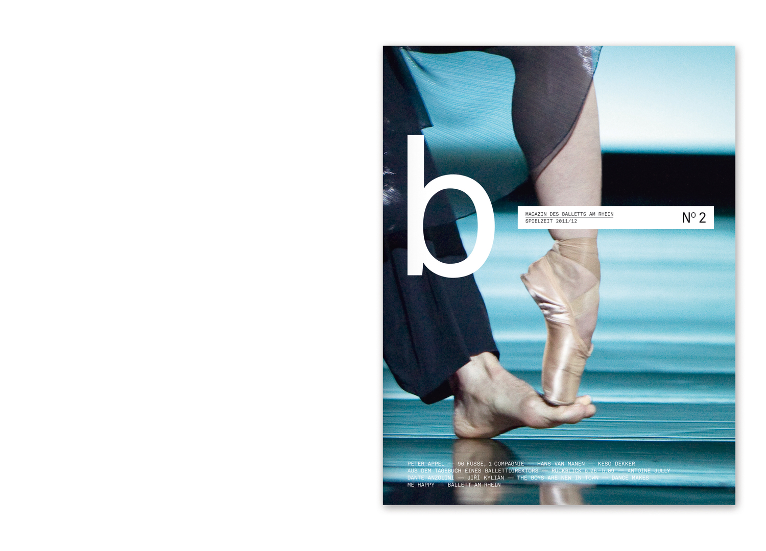 The ballet magazine “b – No. 2”, published by Ballett am Rhein, provides information about the company’s activities through essays, articles and interviews. The heart of the publication is a profile series on the dancers, which eschews the classical depiction of faces and instead gives pride of place to their feet as the means of expressing dance. Further topics, such as an interview with a choreographer and how a stage set comes into being, are presented through both black-and-white and colour photography.