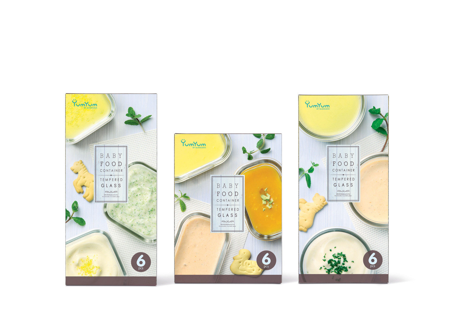 The packaging design of the “Baby Meal Set”, a series of glass bowls for baby food, possesses both an eco-friendly and a hygienic appearance, thus communicating the essential product features of these baby food containers. As an expression of the environmentally friendly product concept, the front side of the packaging shows concrete examples of how to use the containers. Well-balanced colours and an appetising photo setting catch the attention of mothers. For environmental reasons, the cardboard packaging does without coating.