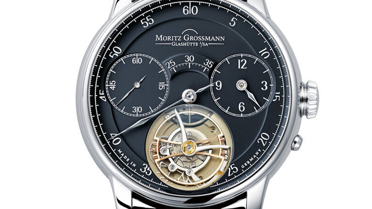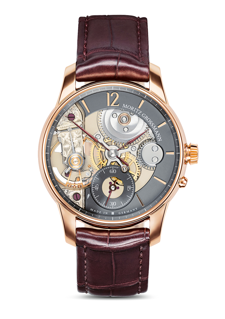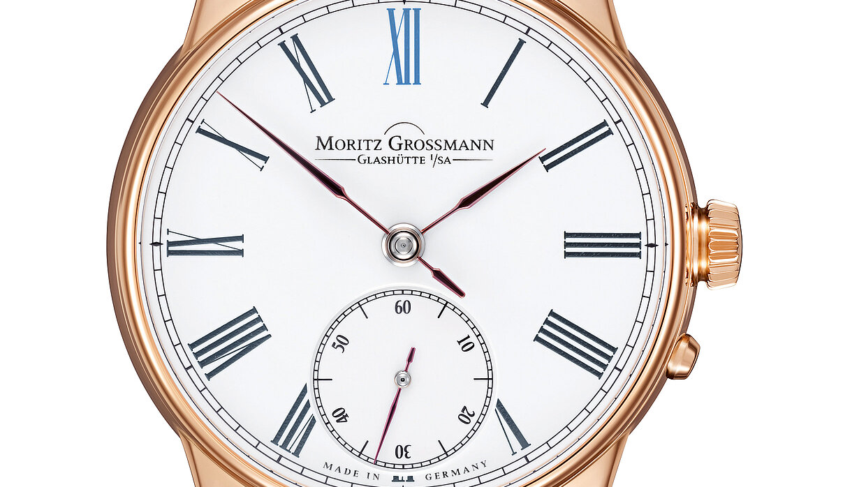 The mirror image calibre 107.0 makes the mechanism of the Backpage visible on the dial side. Through a large aperture, the characteristic movement details such as the Grossmann balance wheel, the hand-engraved balance cock or the ratchet wheel with three-band snailing can all be observed while on the wrist. The fully surrounding minute scale and an hour display from eleven to five o’clock serve as a framework for the moving calibre presentation. The imposed hour indexes and numerals in gold correspond to the colour of the case which is in rose gold. The lowered screwed ring of the small second hand displays the sophisticated bearing of the second hand shaft with a screwed gold chaton.