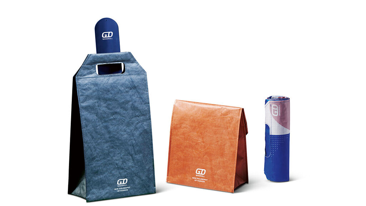 BAGOROLL is a multifunctional, graphically patterned lunch bag consisting of the bag itself, a flat, three-piece cutlery set and a slap strap made of silicone. The latter helps to quickly furl the bag for storage: when activated, it automatically rolls up the bag into a compact form. The strap can also be removed and used as a cuff for a drinking vessel. The bag, which also serves as a place mat, is made of recyclable materials and can be washed and reused.