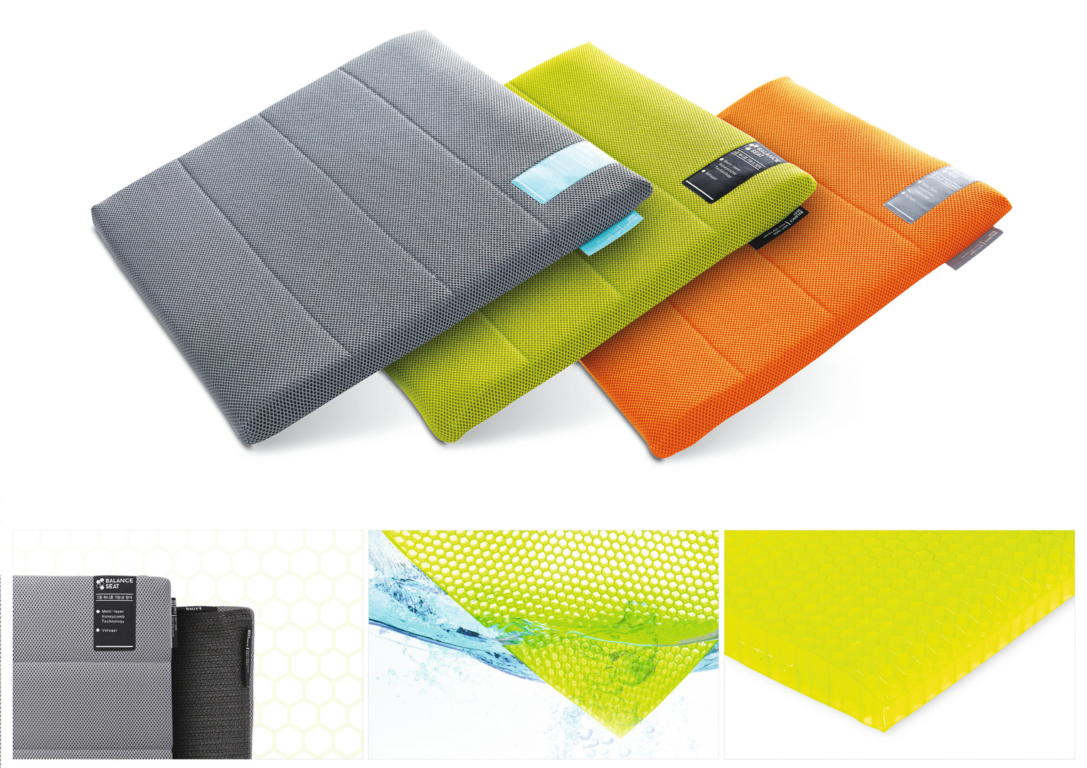 The inside of the Balance Seat is made of a highly elastic and durable gel material called Vetagel. It consists of several layers that have been shaped into a honeycomb structure, absorbing pressure and distributing it evenly. This increases blood circulation, which is particularly important when sitting for long periods. At the same time, any body movements create a pump effect in the honeycomb, which provides ongoing ventilation in the seat to prevent sweating. The outer fabric of the cover is breathable and non-slip. For cleaning purposes the seat may be simply rinsed with water.