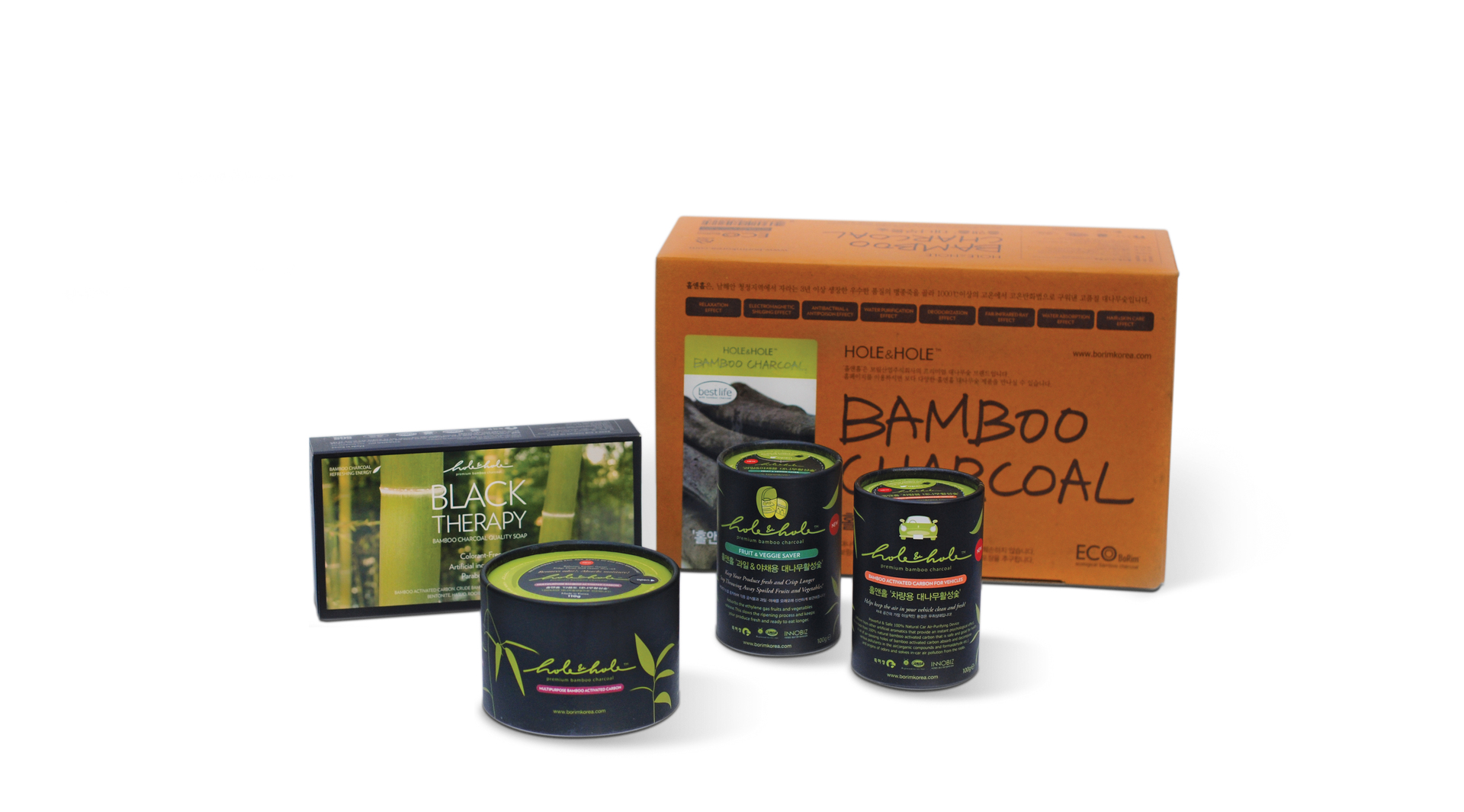 This hair and body care series utilises the effects of bamboo charcoal, such as natural air purification, deodorisation and mineral supply. Bamboo charcoal, the main ingredient of the product, resembles bamboo – it is straight and longish in appearance. To emphasise this characteristic look, paper cylinders are used as packaging for all products. The packaging design visualises oriental beauty and places the qualities of the raw material centre stage by contrasting black, as the main colour, with calm and harmoniously arranged green bamboo leaves.