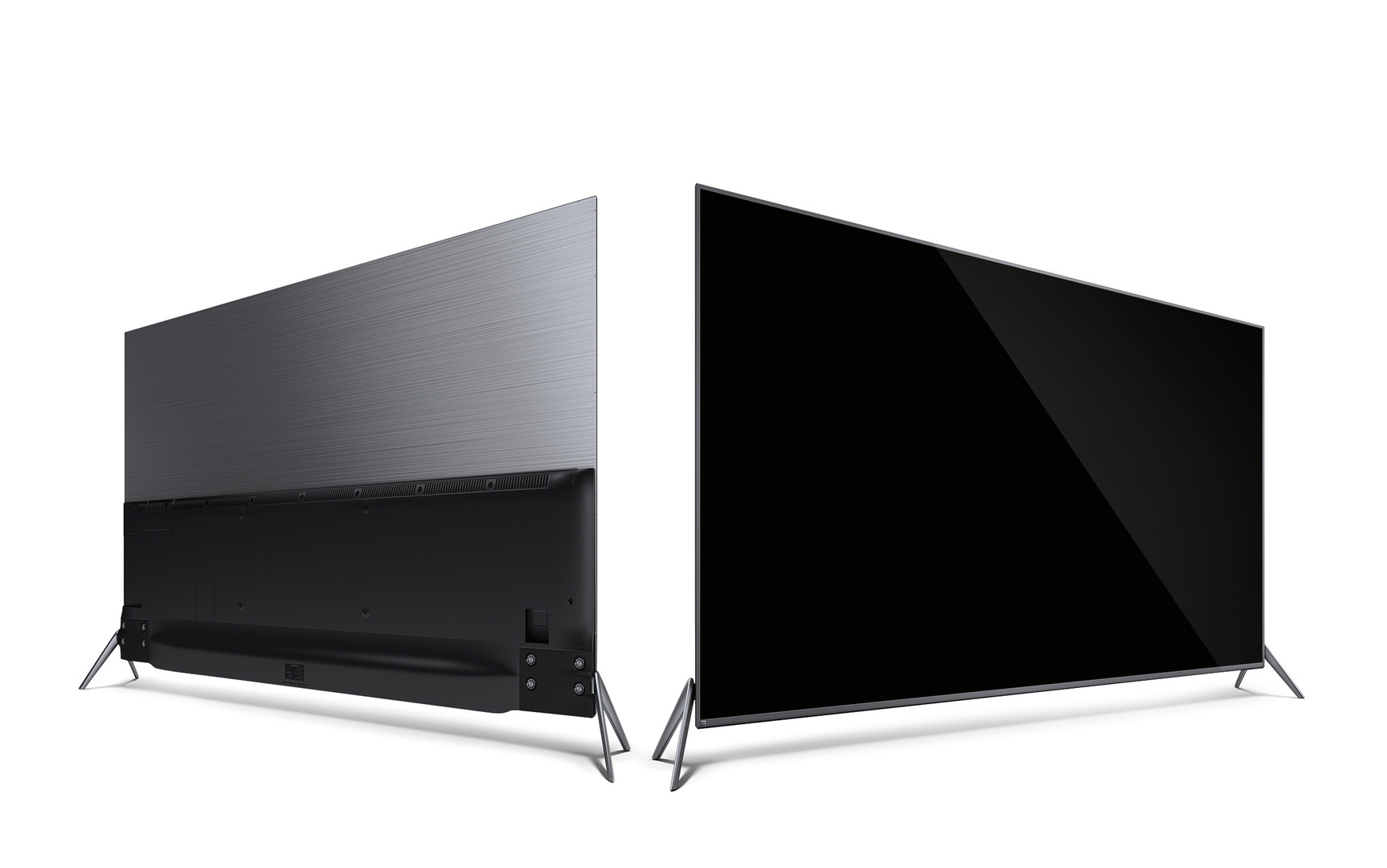 The main circuit board and sound system of this TV are housed in a separate box. In this way, the screen can be kept very slim, and software and hardware upgrades are possible without having to exchange the screen. The screen frame is made of stainless steel, and the stands are likewise fashioned from metal. They convey stability, while also lending the television an airy impression. The surface has been coated with a metallic paint to render the unit more robust against external impact.