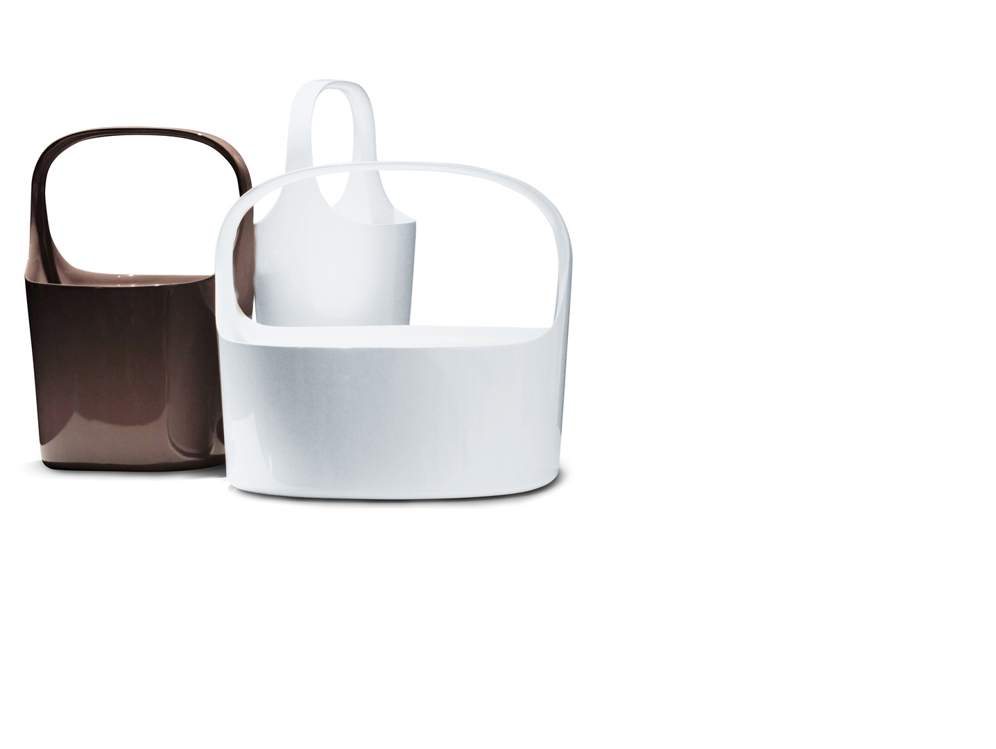 These side tables are reminiscent of baskets. Their curved handles make it easy to move them from the sofa to the armchair or to any place desired. They can also be used as trays when there are visitors. The tables are made of a light composite material and are available with a high-gloss or a matt surface in a variety of different colours.