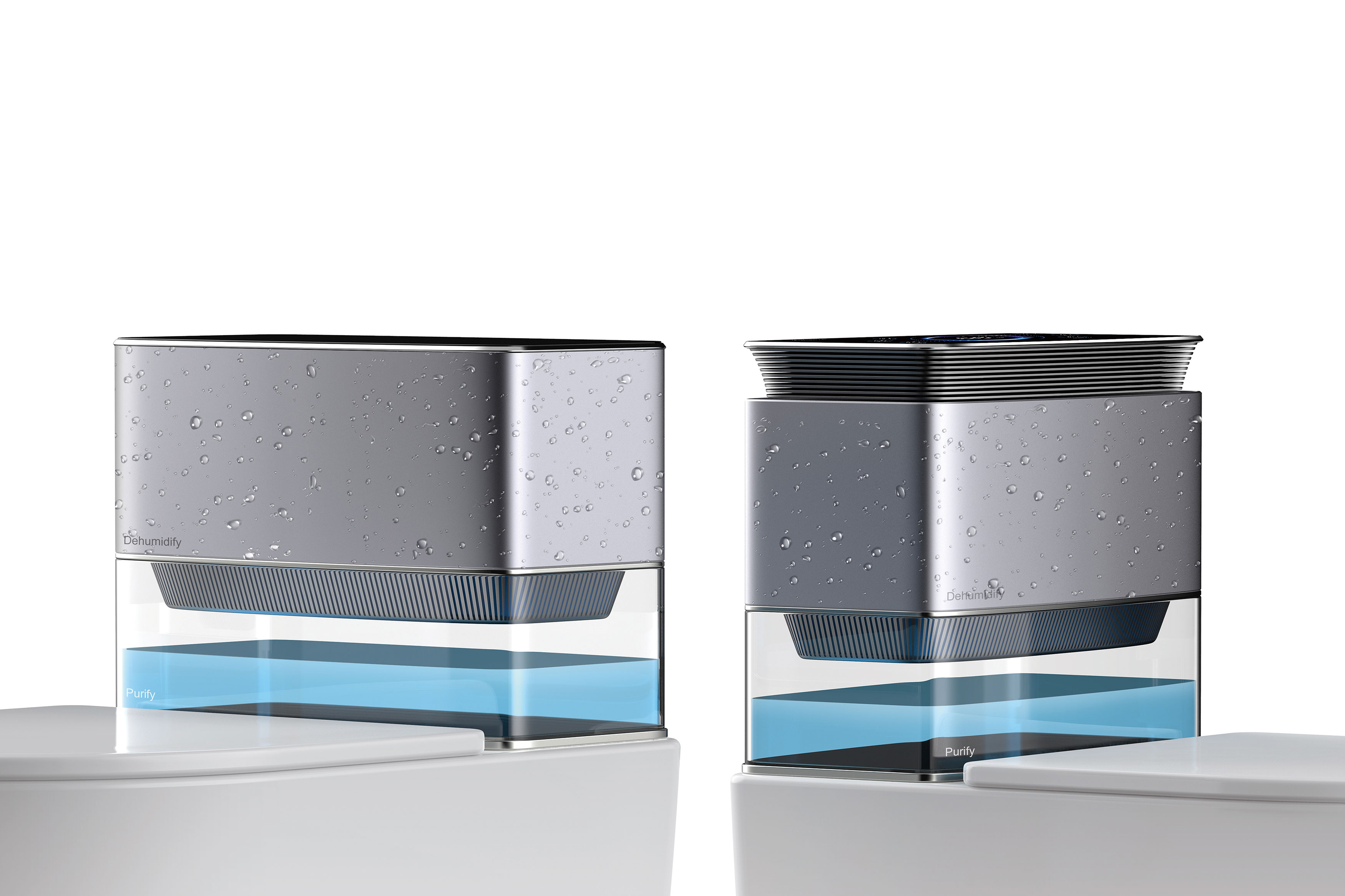 This dehumidifier converts air moisture into water for toilet flush tanks to reduce freshwater demand. Its three main functions are wastewater recycling to convert moisture into toilet water, a double discharge design with a waterproof display and removable vent to protect appliances, and water purification and sterilisation with deodorisation. By reusing bathroom moisture, the device promotes water recycling and an eco-friendly lifestyle.