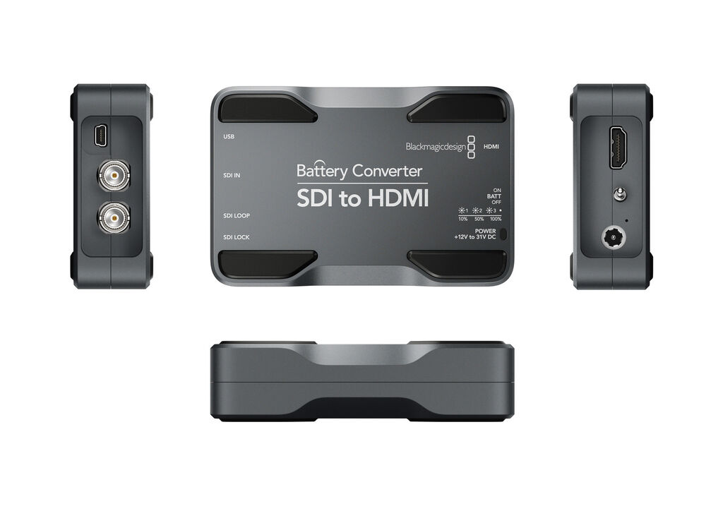 Thanks to its built-in battery, this battery converter provides uninterrupted signal conversion for live outdoor productions without the need for external power. It features time-saving automatic detection of SDI or HDMI video formats and utilises the latest high-frequency technology to transmit flawless HD or SD video across long cable lengths. The compact aluminium casing is palm-sized and thus fits into any camera bag, yet the converter is also strong enough to be run over by a truck and keep working. The laser-etched graphics are scratch-resistant, whilst the silicone feet provide a high-grip base. Integrated LEDs indicate the built-in battery’s charge level.