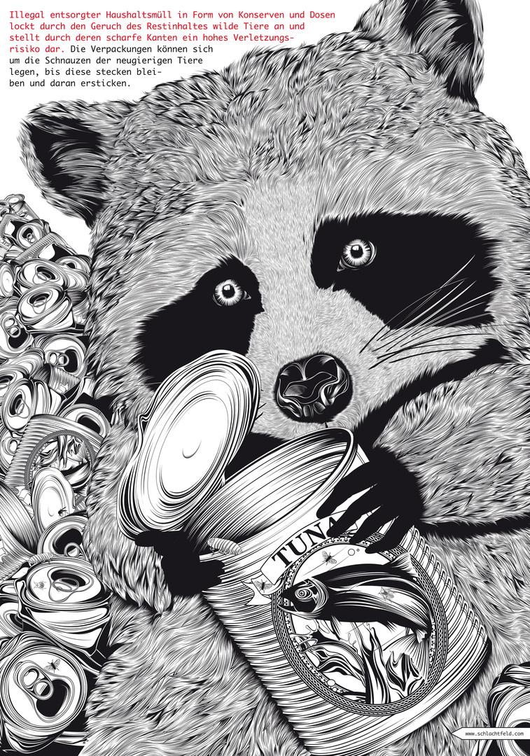With a distinct approach this work brings up a painful subject and a serious issue of our times. It poignantly illustrates a future world in which growing mountains of waste disrupt the habitats of animals, harbouring many dangers for them. The vector illustrations, which are technically very well implemented and in part surrealistic, are highly expressive and possess a unique, appealing aesthetic.