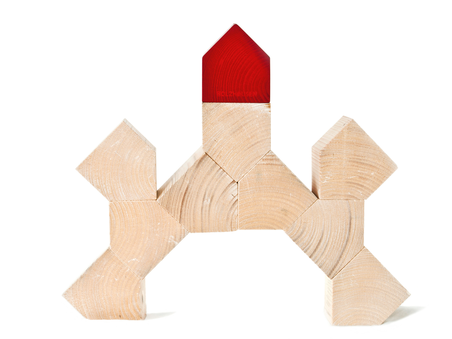 With their compact shape, clear lines and proportions, these wooden house-shaped blocks appeal to many senses. They invite both big and small children to touch and discover, play, build and experiment with them, offering an almost unlimited playground for a large variety of different constructions. Each set comprises 25 blocks made of regional lumber from sustainable forestry; the paint used for the red house is environment-friendly.