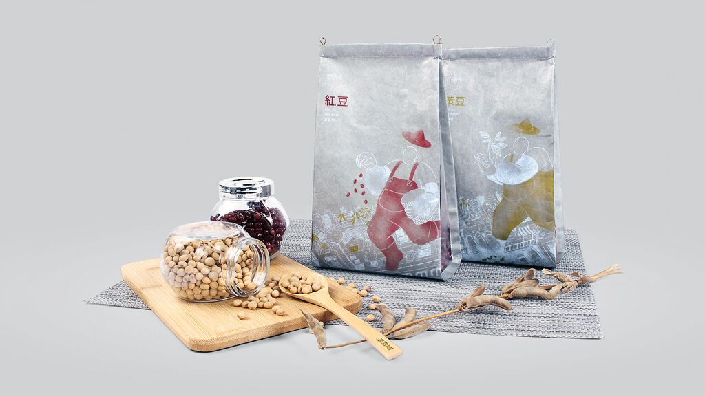 The Beans Promote brand concept aims to communicate the benefits of legumes grown in Taiwan and thus gain popular acceptance for these local foods. The packaging for different types of beans from the south of the country show colourful illustrations of farmers working in the fields. The locally inspired impressions are applied with UV inkjet printing on paper which is water and tear resistant and can therefore be reused. The integration of interactive media provides consumers with additional information on the respective products.